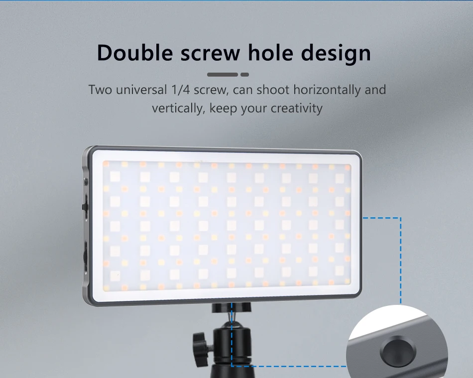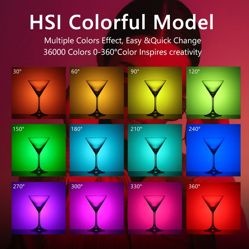 Светильник для фотосъемки: оттенок регулируется на 0-360 полноцветная гамма; Насыщенность цвета регулируется на 0%-100%; Яркость регулируется на 0%-100%; цветовая температура затемнения от 2500K до 9000K; Встроенный ЖК-дисплей для точных показаний делает вашу работу более эффективной.