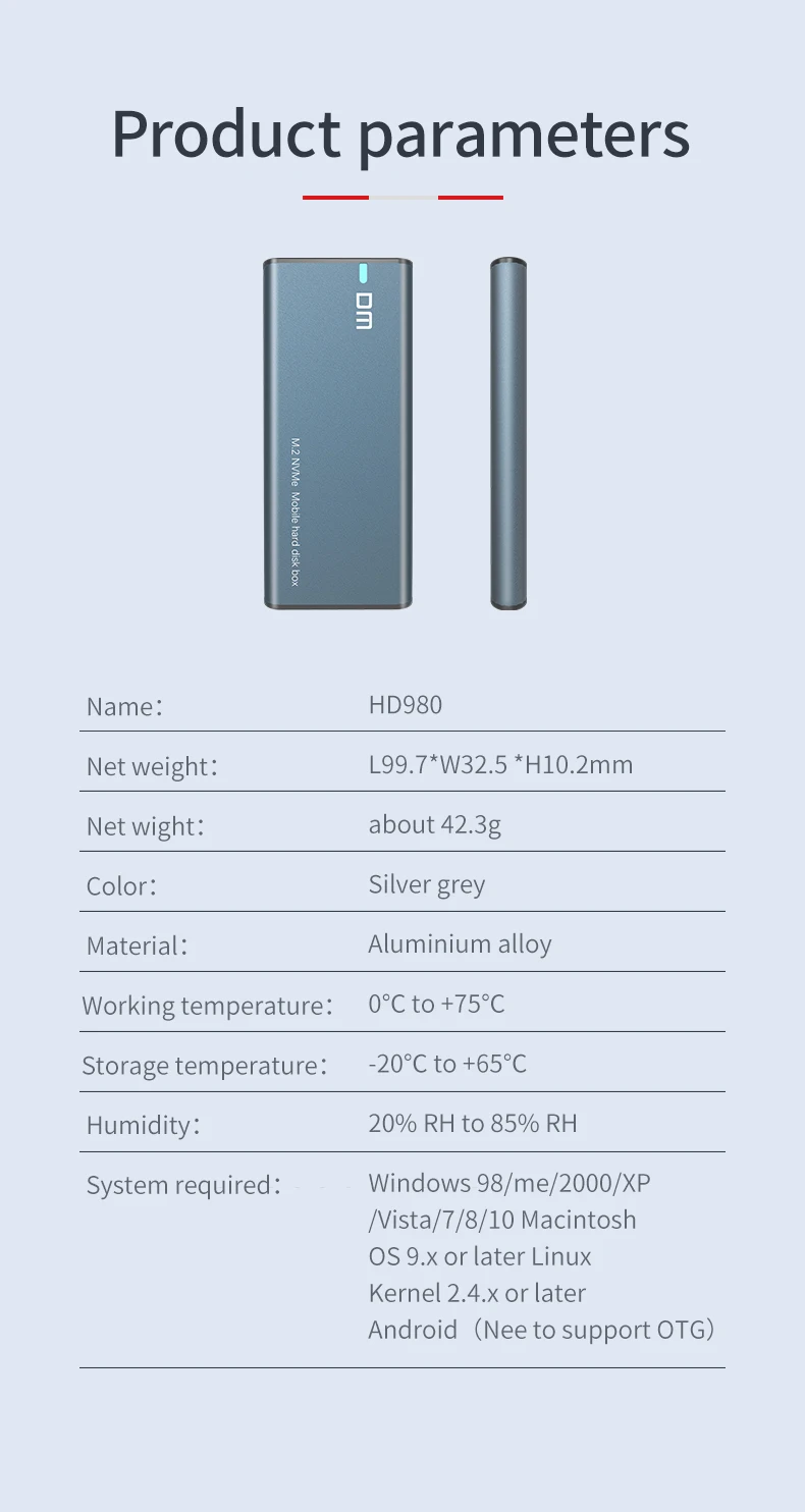 Название бренда: DM Размер: L99.7 * W32.5 * H 10,2 мм Внутренний интерфейс: PCIE 3,0, 10Gbs Внешний интерфейс: Type C 3,1 Gen2, 10Gpbs Поддержка жесткого диска: 2230/2242/2260/2280 Материал корпуса: алюминиевый сплав M.2 NVME SSD 10 Гбит/с к USB 3,1 Type-C адаптер Корпус чехол твердотельный жесткий диск Особенности: 1. M.2 NVME к USB3.1 жесткий диск Корпус чехол M2 SSD Type-C жесткий диск коробка. 2. Совместимость со спецификацией SATA 3,0 3. Безопасно подключает NVME ключ SSD к компьютеру через порт USB C. 4. Поддерживает 22*30 мм. 22*42 мм, 22*60 мм, 22*80 мм твердотельный жесткий диск NVME (жесткий диск в комплект не входит). 5. Поддерживает передачу данных до 10 Гбит/с. 6. Поддерживает функцию загрузки. 7. Поддержка plug & play и hot-swapping. 8. Прост в использовании, не требуется драйвер. Примечание: В комплект входит только жесткий диск, жесткий диск SSD не входит в комплект. Возможна погрешность в 1–3 см, связанная с особенностями измерения вручную. Из-за различных дисплеев и различного светильник, изображение может не показать фактический цвет товара. Спасибо за понимание.