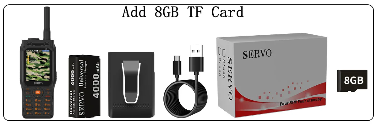 1 * телефон, 1 * чехол на ремешке, 1 * аккумулятор, 1 * USB кабель, 1 * коробка, 1*8 Гб карта памяти
