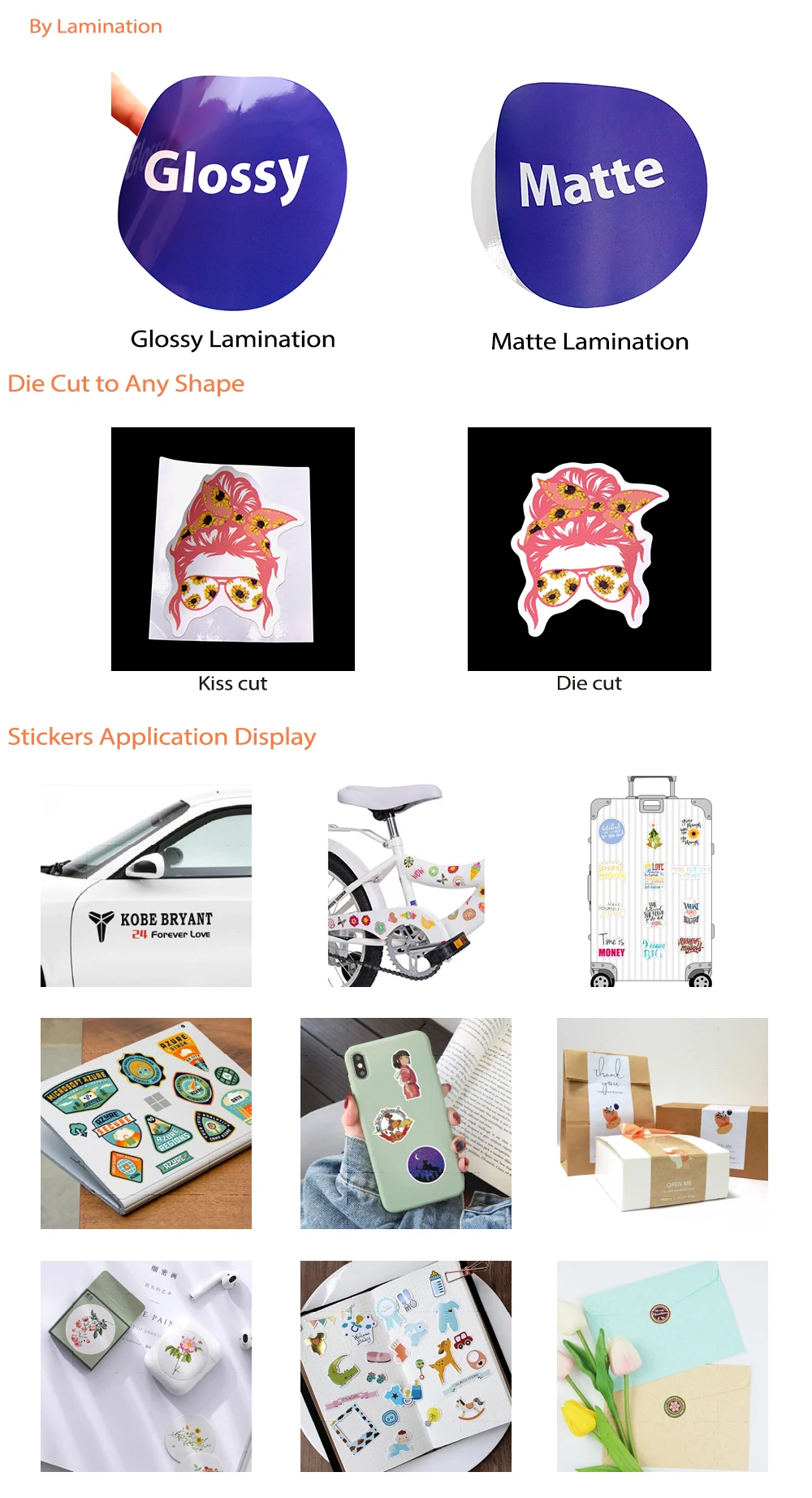 1. Тип: Виниловая наклейка, белая/прозрачная задняя часть с матовой или глянцевой ламинацией.