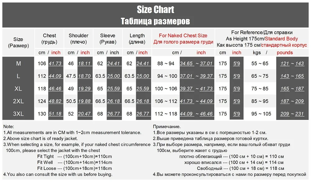 Все вышеуказанные измерения являются фактическими измерениями одежды. Для хорошей посадки, пожалуйста, добавьте 4 см ~ 6 см к вашему телу при выборе размера из таблицы выше. Перед выбором размера убедитесь, что вы правильно измерили свой размер, чтобы избежать ошибок.