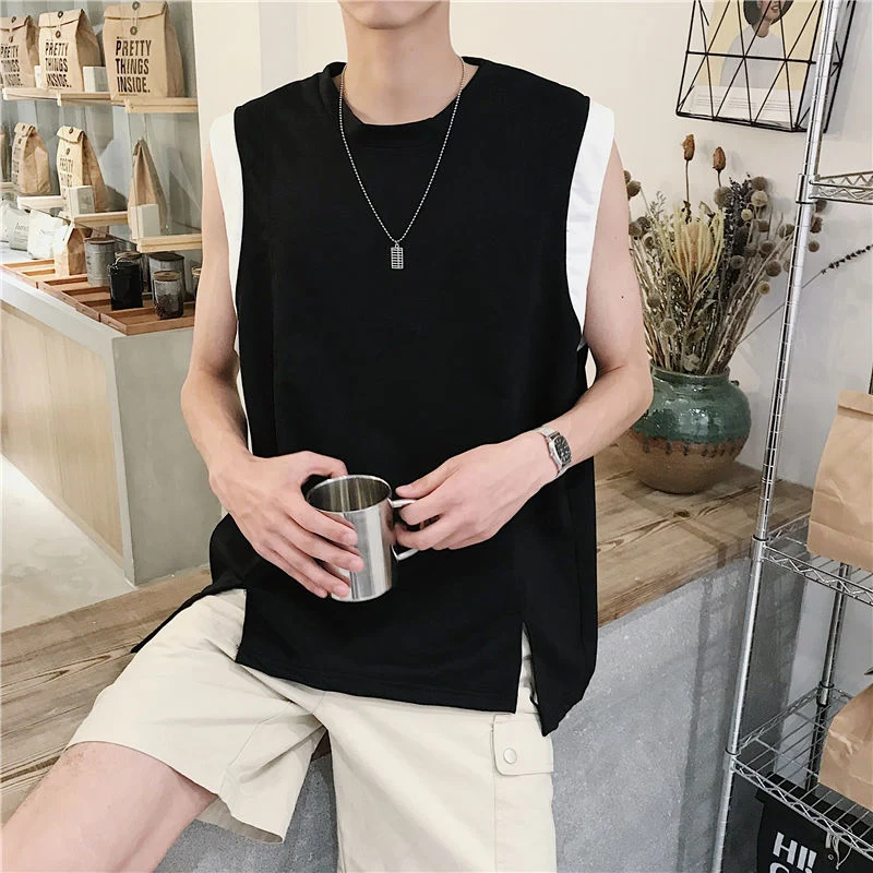 Мужская жилетка с разрезом и вилкой, хит 2022, летняя модная Корейская свободная футболка без рукавов с фальш-вставкой, универсальная спортивная футболка