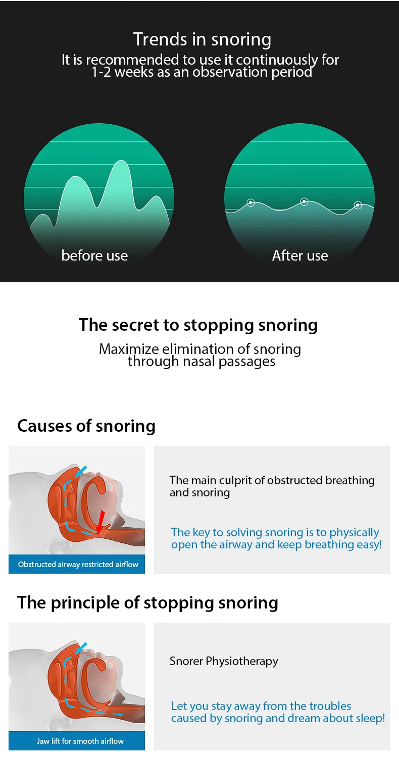 3. Перезаряжаемый, изготовлен из силиконового материала, без запаха, чрезвычайно мягкий и удобный для разных размеров носовых ходов, научно разработан, чтобы максимизировать поток воздуха через носовой проход и эффективно облегчить храп.