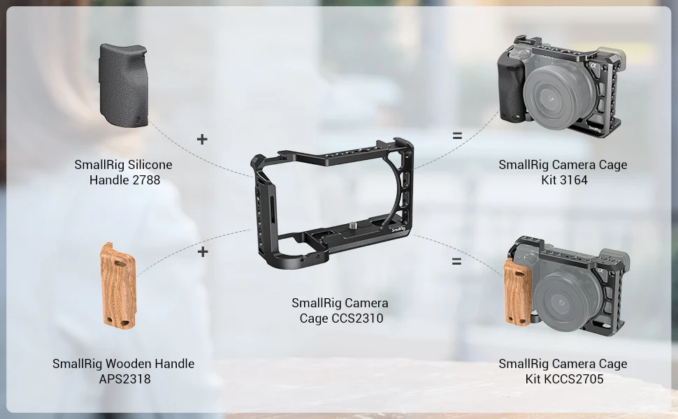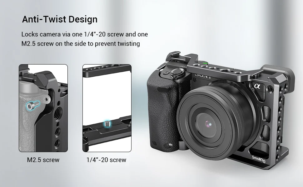 SmallRig клетка с силиконовой ручкой для камеры Sony A6100/A6300/A6400 3164 Предназначен для защиты камеры и обеспечения аксессуаров монтажных точек. Имеет съемную силиконовую ручку, которая не скользит, не замерзает и удобна в захвате. Клетка крепится к камере одним винтом 1/4 ”-20 и обеспечивает дополнительную точку блокировки с отверстием плечевого ремня на правой стороне, чтобы предотвратить скручивания. С несколькими резьбовыми отверстиями 1/4 "-20, ARRI 3/8"-16 отверстий для крепления Крепление для монитора 2903, Мини Топ Ручка 2771 Или другие аксессуары, чтобы настроить полный комплект для ваших видео продукции. Верхняя часть клетки поставляется с двумя креплениями для холодного башмака для прямого крепления микрофона или звукового приемника. Нижняя часть интегрируется с Arca швейцарская тарелка для быстрой передачи на штатив Arca. Встроенные Резиновые прокладки в нижней части защищают камеру от царапин. Кроме того, клетка поддерживает доступ к кнопки для камеры, портов и инфракрасного приемника. Встроенная отвертка с плоской головкой хранит в нижней части для быстрой сборки и разборки. Опционально Кабель HDMI зажим 1693 Доступен отдельно для защиты порта HDMI.