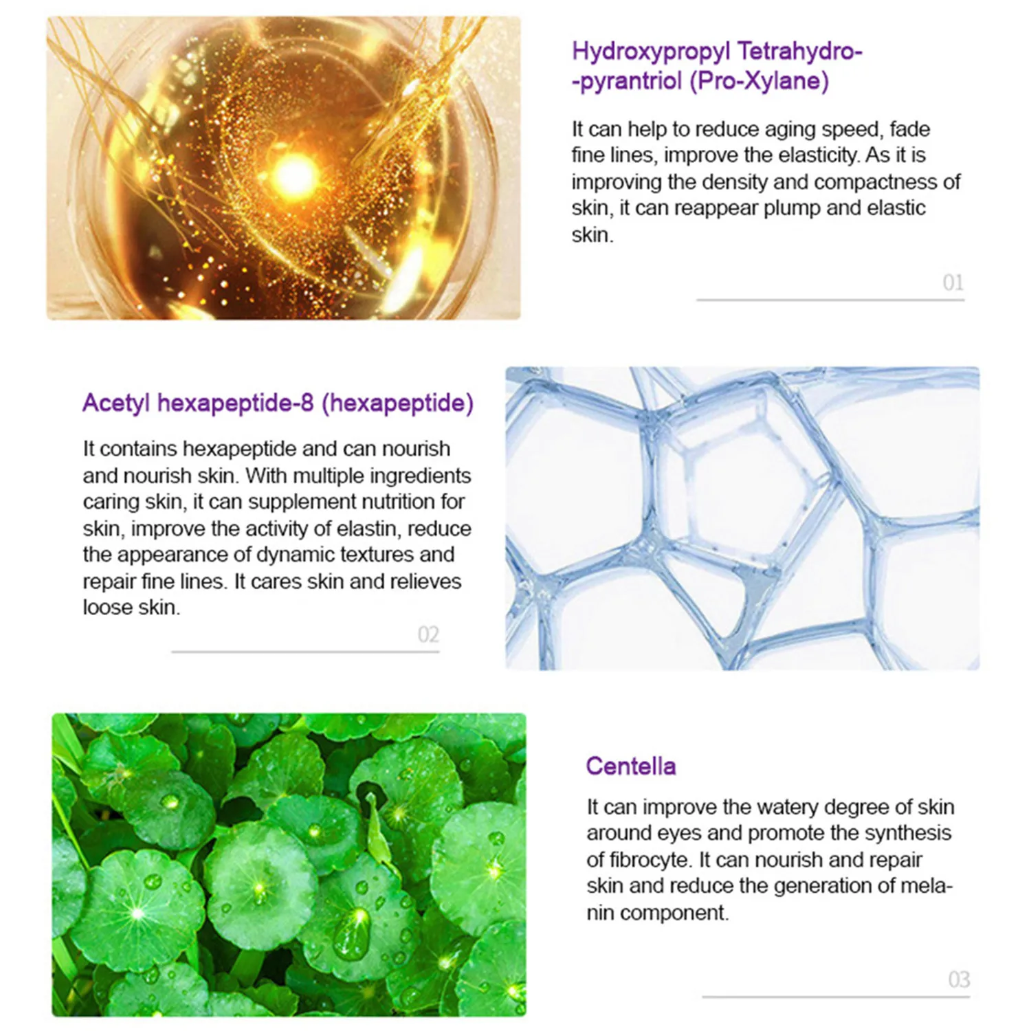 ● Эффект: легко наносится, питает кожу вокруг глаз, мягко ухаживает за нежной кожей вокруг глаз и эффективно успокаивает сухую кожу. Кожа вокруг глаз мягкая, гладкая и тонкая. Он может излучать вашу кожу.
