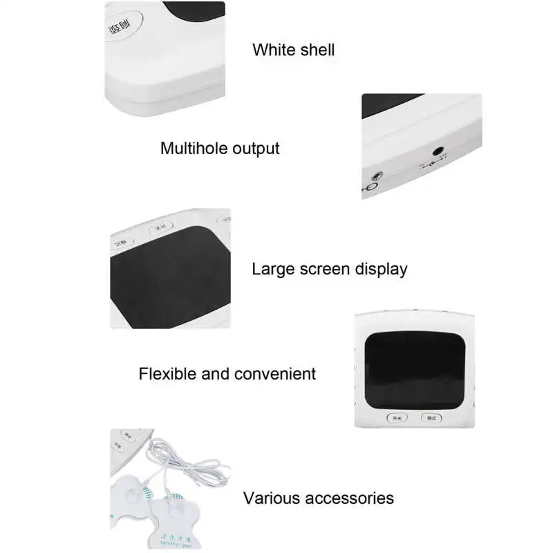 4. Многокомпонентный массаж: электронный импульсный массажер принимает мульти выход отверстия для массажа нескольких частей одновременно, который является гибким и удобным и подходит для нескольких частей тела.