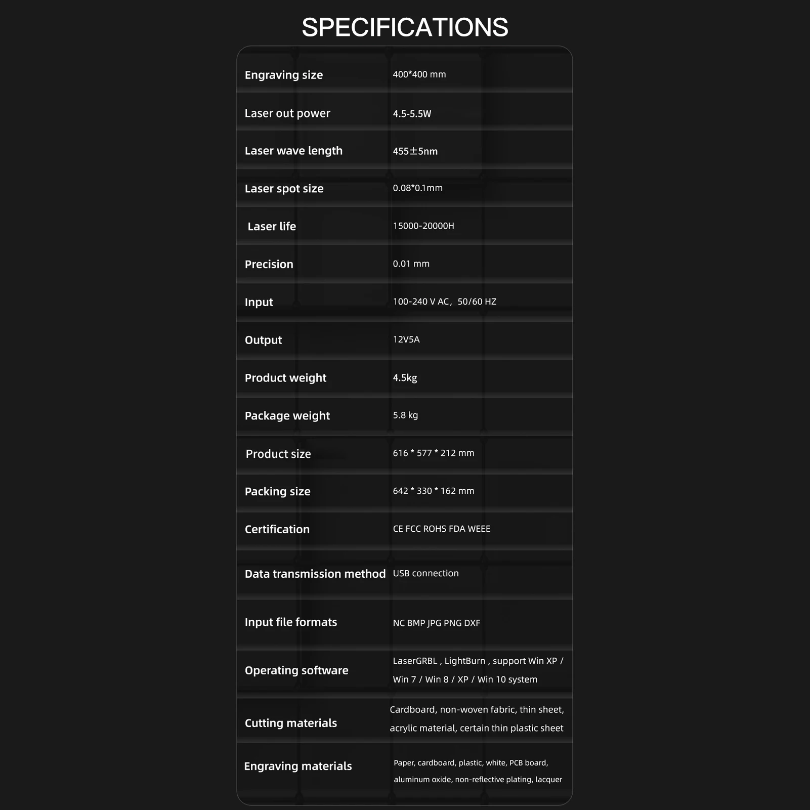 【 Ультратонкий компрессионный лазер:Лазерная Выходная оптическая мощность составляет 4,5-5,5 Вт, высокой мощности лазерной гравировки является безопасным и эффективным способом доставки более точным. Данная ультратонкая Лазерная точность снижена до ± 0,01 мм. С высокой плотностью лазер может непосредственно выгравировать гладкая нержавеющая сталь металла и керамики.