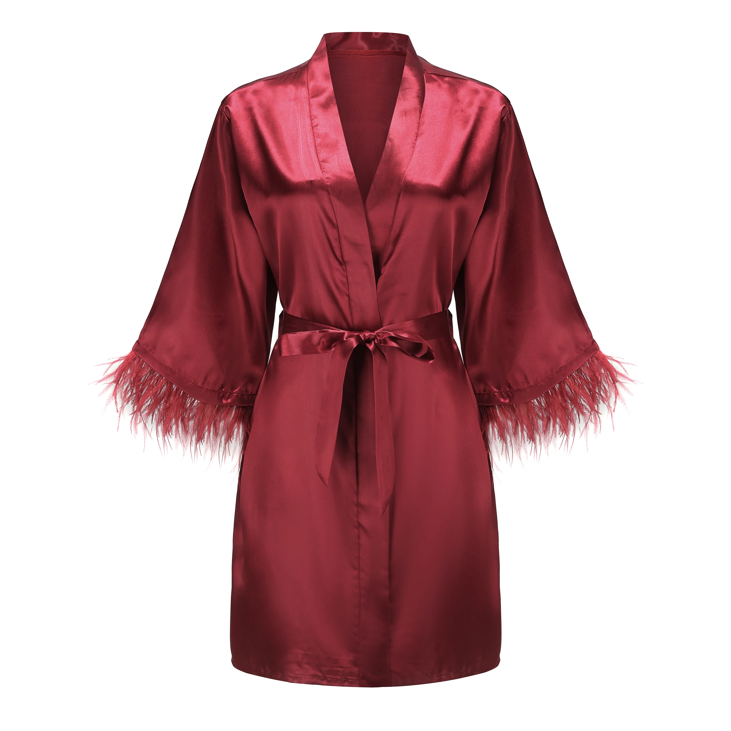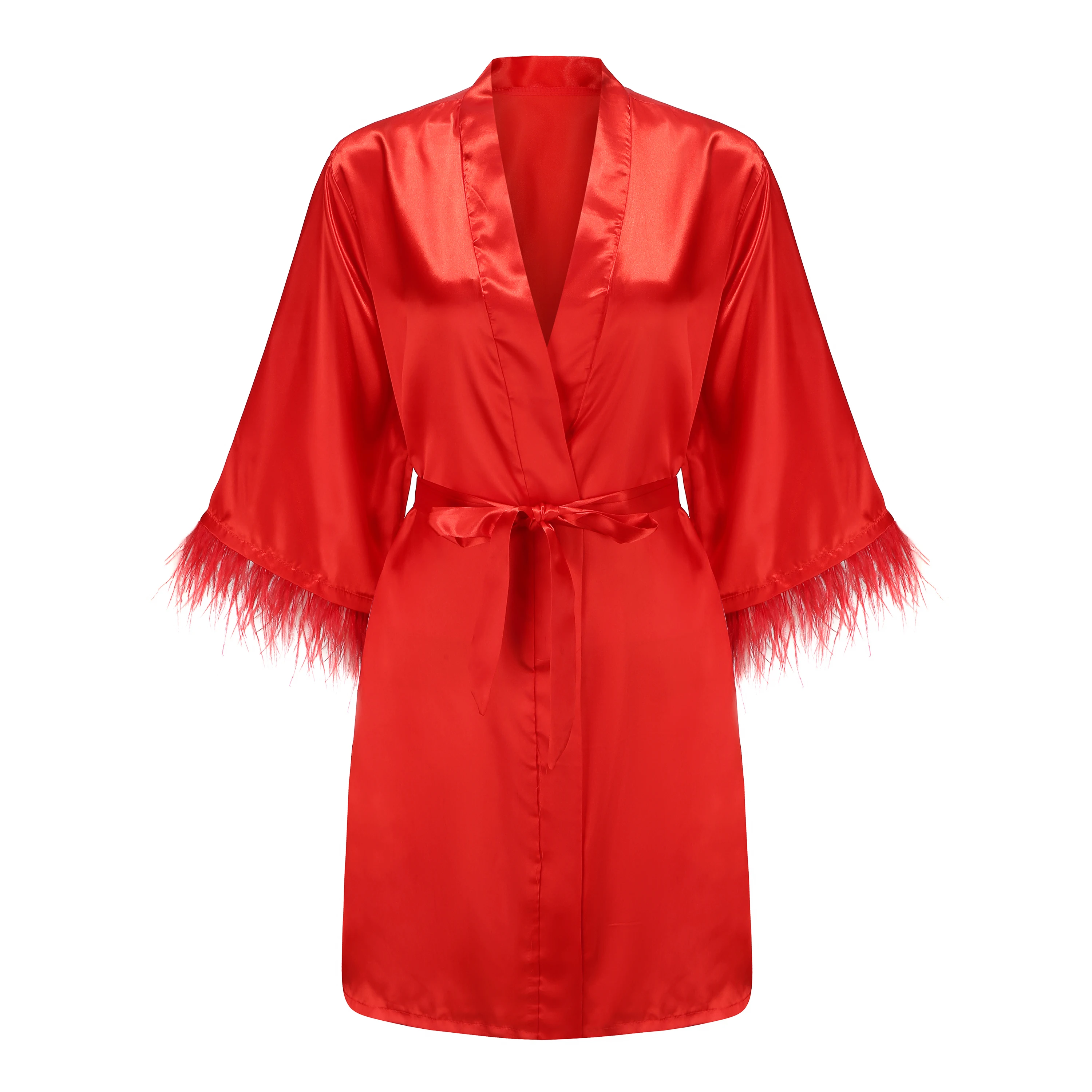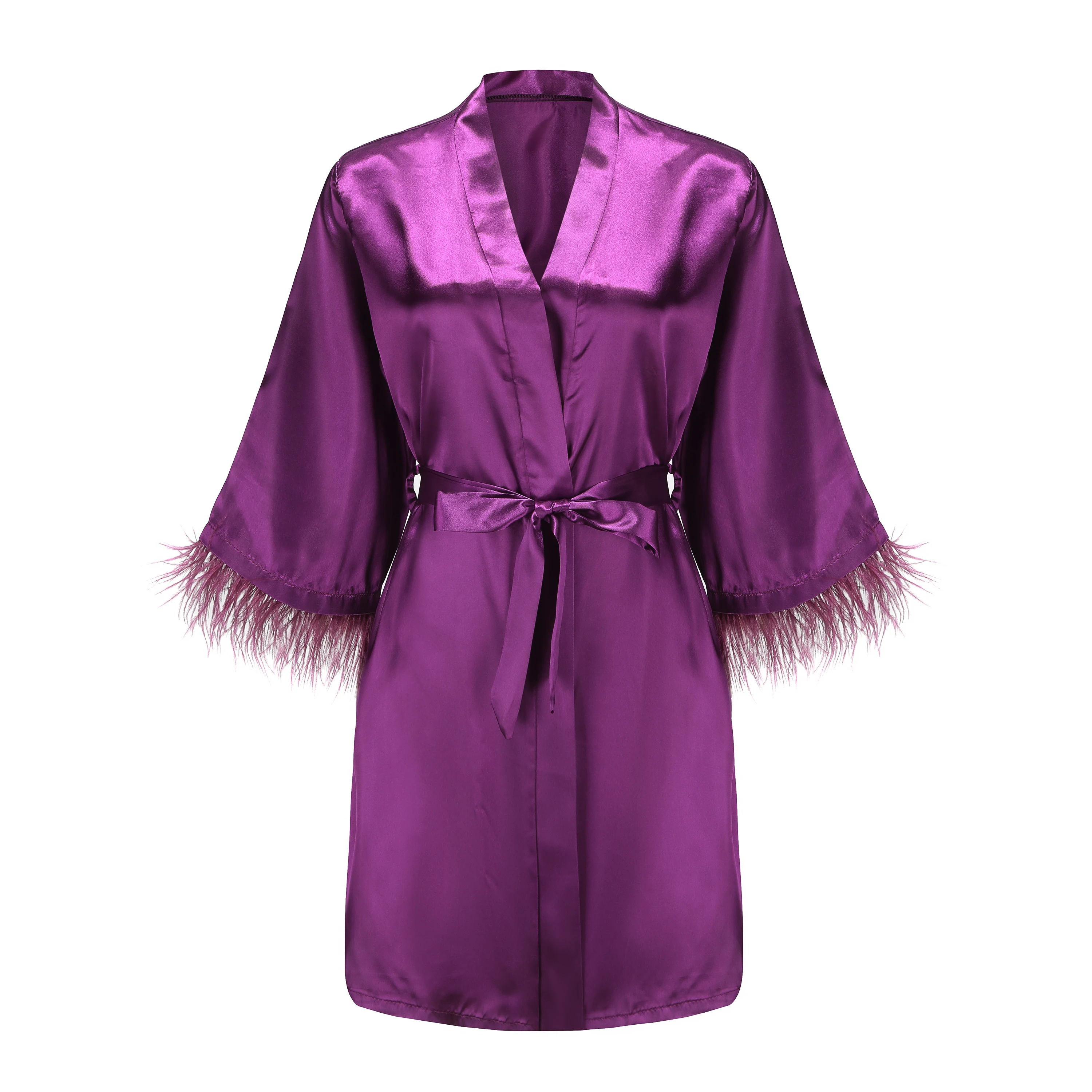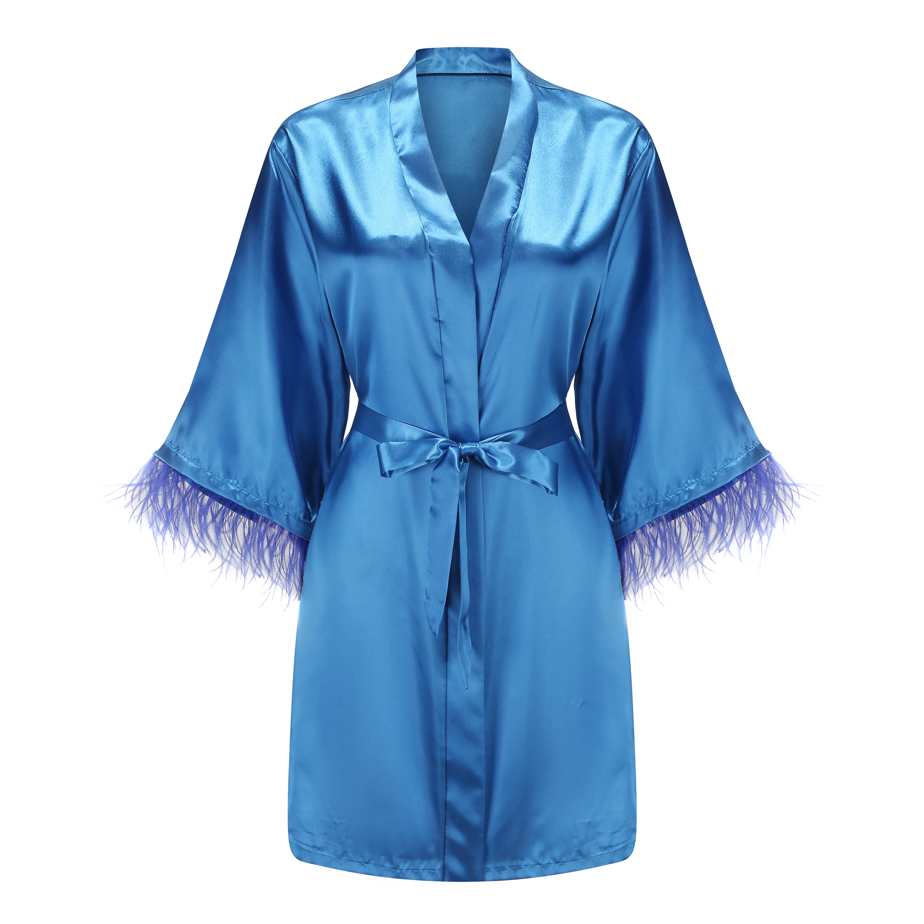 Ткань: короткий халат с отделкой перьями изготовлен из качественного атласа, не только шелковистый, но и мягкий и очень удобный