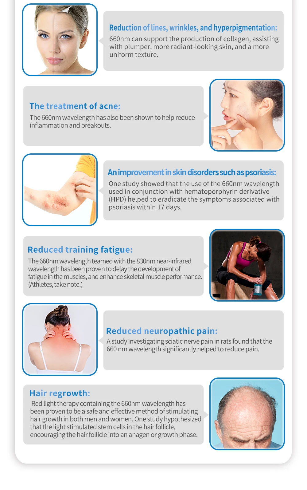 Длина волны 660нм проникает глубже, чем длина волны 630нм, длина волны 660нм достигает всего диапазона тканей кожи, что способствует заживлению и регенерации. Преимущества снижения усталости при тренировках, воспаления, отечности следуют за травмами и невропатными болями; Улучшенное заживление костей и ускоренное заживление ран.