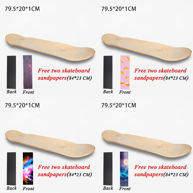 -Задняя часть скейтборд была лаком, поверхность гладкая, вы можете вставить наждачная бумага, расписанные вручную узорами, краска, украшения и т. д.