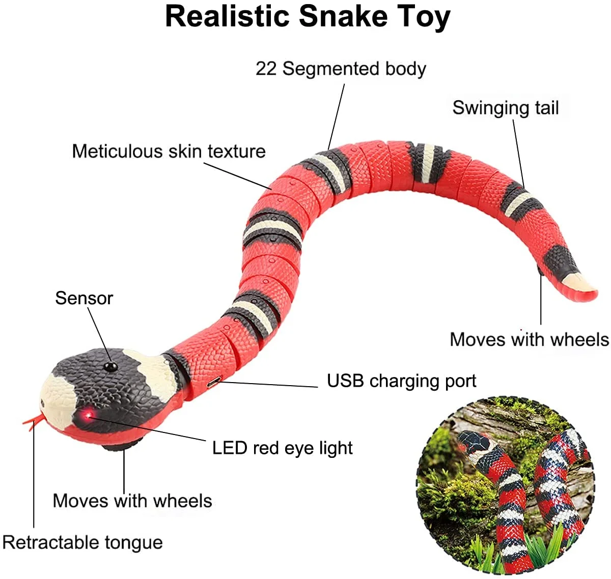 1. Включите переключатель s-типа Ползания. Когда вы сталкиваетесь с препятствиями, глаза будут мигать и автоматически поворачиваться и поворачиваться, язык может быть растянут, хвост качается, и он войдет в спящее состояние после непрерывного воспроизведения около 1 минуты. Нажмите на змеиную головку, чтобы войти в режим воспроизведения