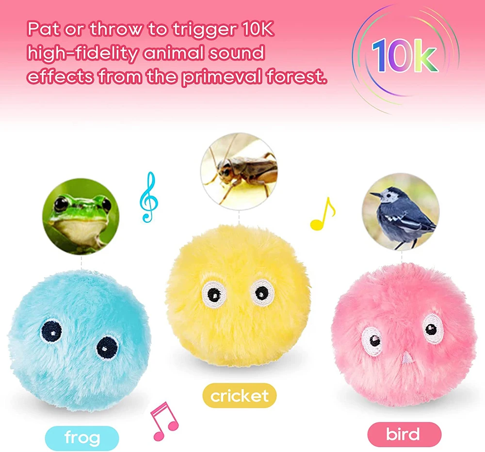 【Chirping Balls】 эту игрушку содержит 3 2,2 "пушистые плюшевые мячи. Яркое животное щебетает при прикосновении (лягушка/светло-голубой, крикет/ярко-желтый и пение птиц/ins розовый). И встроенной батареи делают каждую кошка игрушка мяч последний 10000 время цикад.