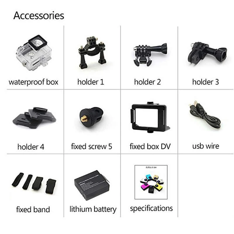 Дисплей: естьВстроенный микрофон: естьРазрешение видео (MAX): 2МрWi-Fi: нетПоддержка карт памяти: естьЦвет: черный, золото, белыйВес: 58гРазмер: 59*41*25 ммМатериал: пластикКомплектация: водонепроницаемый чехол, крепления для шлема/велосипеда, кабель ЗУ, блок питания, инструкция на Русском