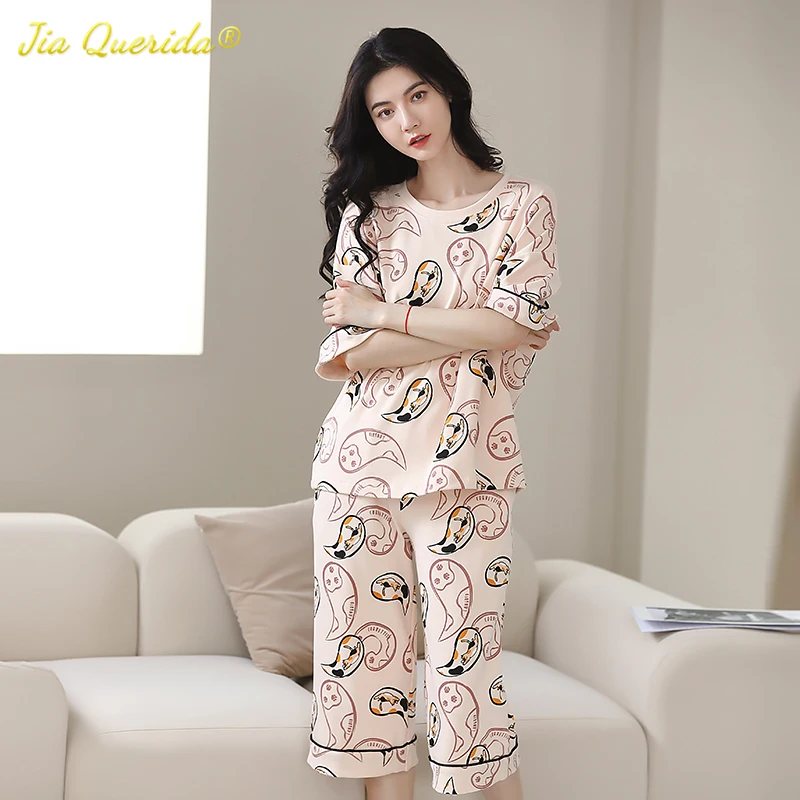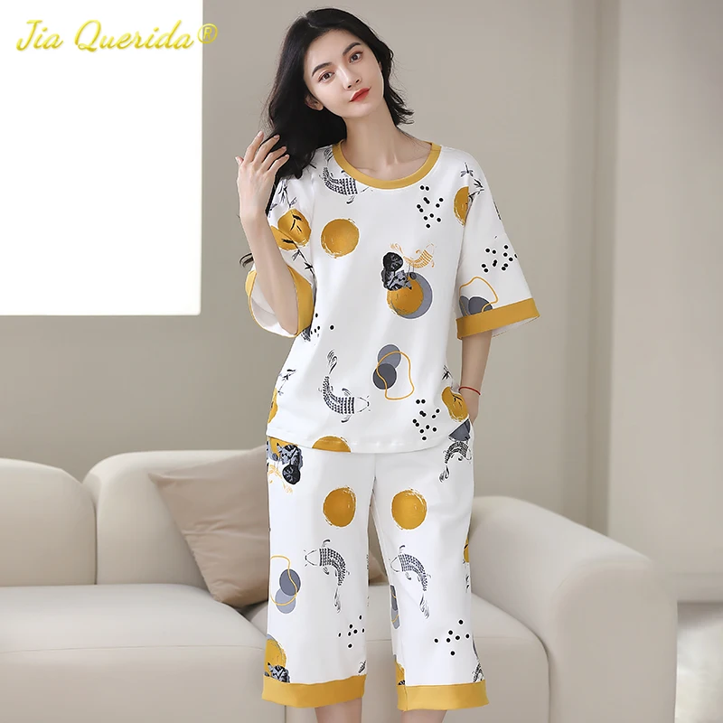 Отзывы о Женский пижамный комплект M-5XL большой размер длина до колена круглый вырез
