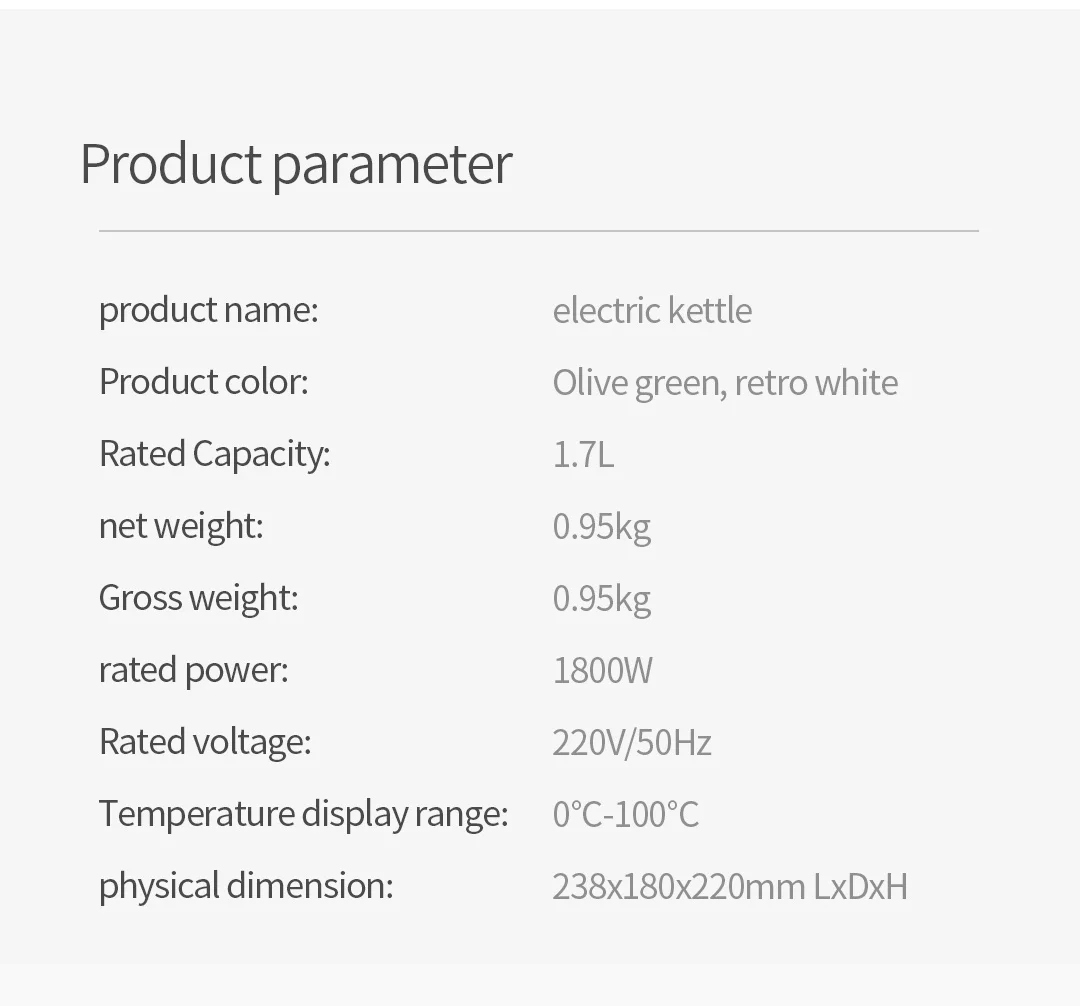 * Температура отображается в режиме реального времени, 70 & deg; Подходит для изготовления сухого молока, 85 & deg; Может сделать листья чая, и 100 & deg; Безопасно для питья. * Корпус горшка изготовлен из полноразмерной пищевой нержавеющей стали марки 304. * Устойчивая к пятнам и легкая Чистящая подкладка, устойчивая к коррозии, стойкая к окислению, легко моется. * Используется Британский термостат STRIX. * Анти-сухое сжигание сбой питания, паровой индукции сбой питания. * 1800 Вт Высокая пудра, быстрое кипячение воды, всего 4-5 минут для кипения 1,7л. * 1.7 л большой емкости. * Управление одним нажатием, 360 & deg; Основание вращения. * Нижняя часть горшка оснащена потайным слотом для провода: длину можно регулировать по желанию. * Встроенная водная Линейка: предотвращает сухое горение или перелив.