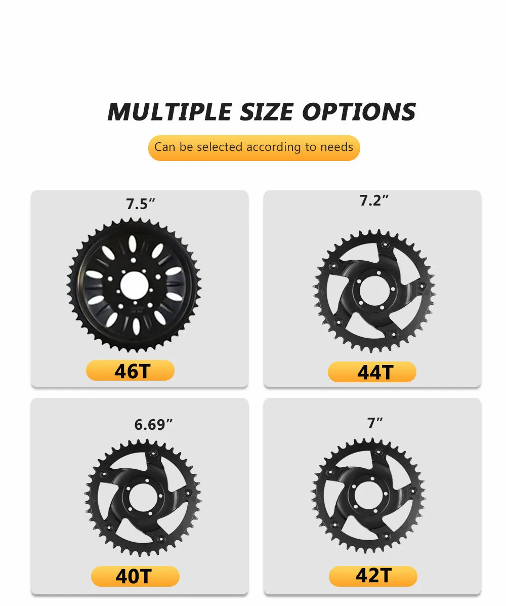 BBS01B BBS02B цепное колесо: 46T 44T 42T 40TЗамена тормозного рычага на тормозной датчикПожалуйста, оставьте нам сообщение, если вам нужно изменитьУ этого мотора есть вилки для поддержки 6v светильник и датчик передачиСпецификация мотора: