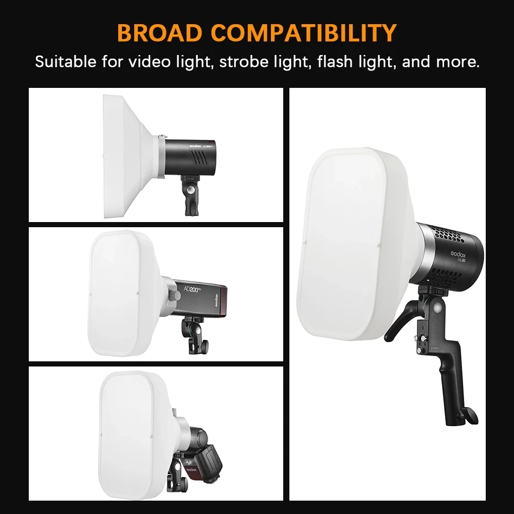 Поставляется с адаптером Godox, адаптером с круглой головкой и адаптером с прямоугольной круглой головкой, широко совместимым с большинством видеоламп и вспышек.
