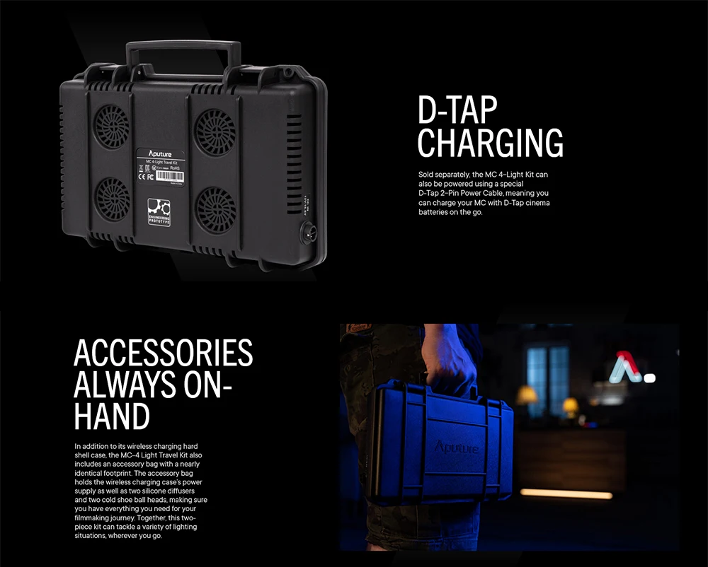 Дорожный набор Aputure MC 4-светильник предназначен для кинотеатров guerilla и Travel. Благодаря удобству беспроводной зарядки Прочный жесткий чехол, который достаточно тонкий, чтобы поместиться в сумку или рюкзак для камеры, позволяет всегда быть готовым к любой ситуации, находясь в движении.