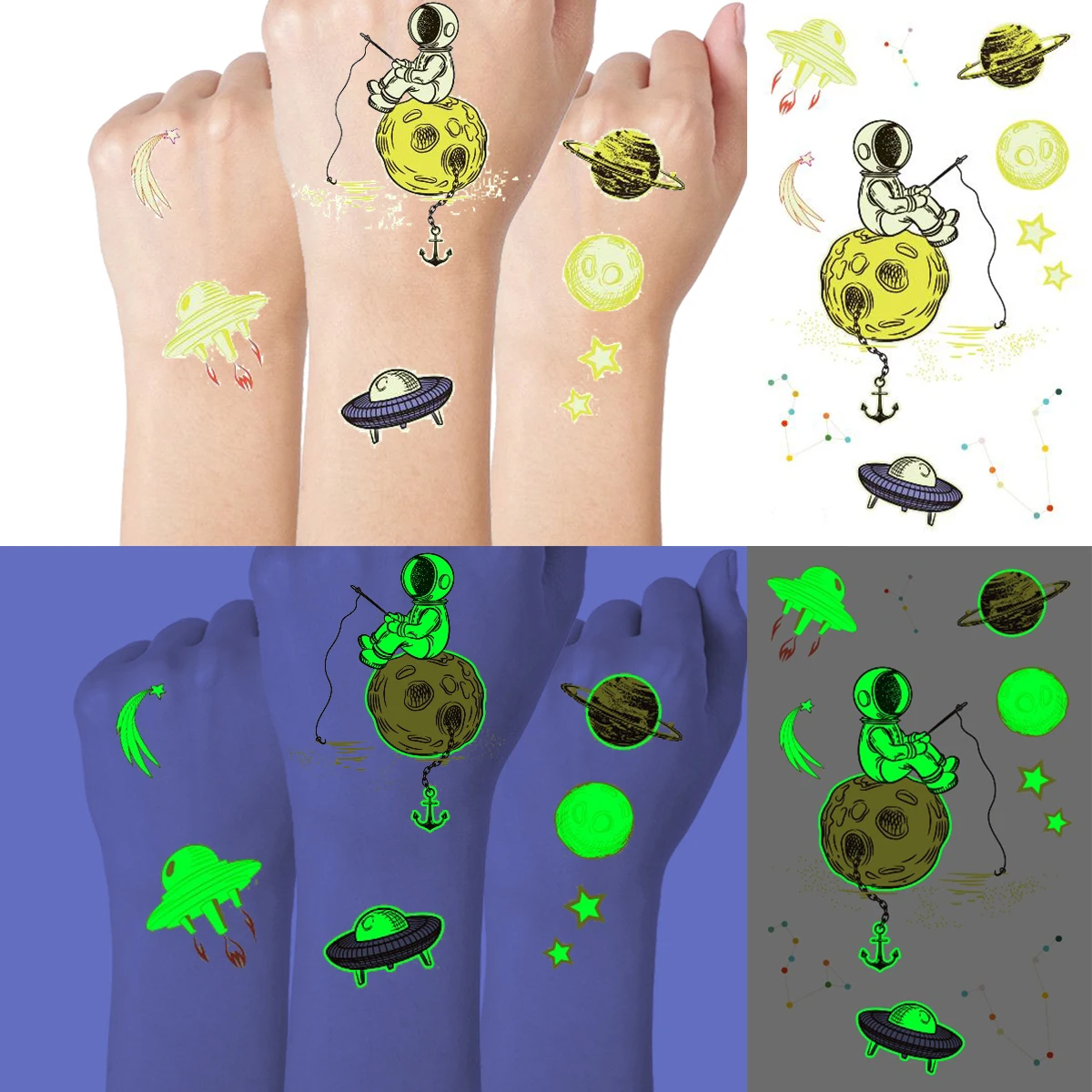Светящиеся Временные татуировки для автомобиля для мальчиков и девочек, светящиеся в темноте, астронавт, гонки, поддельные татуировки, наклейки для детей, водонепроницаемые, Rocket Tatoo