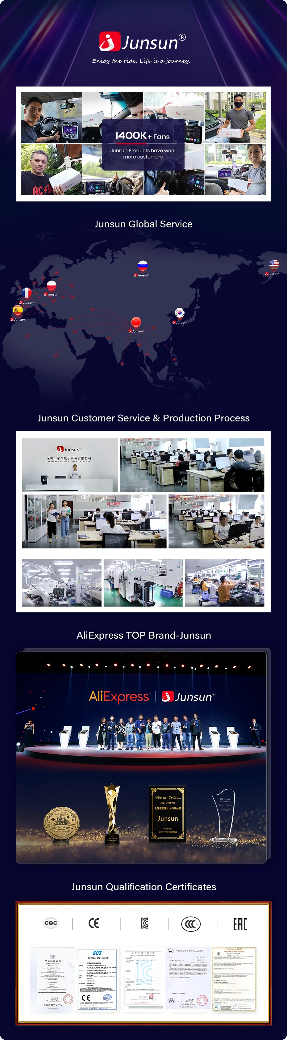 2.AliExpress Топ-10 самых лучших брендов, компания Junsun имеет 1300K + вентиляторы, пользуется популярностью среди клиентов. Наша цель-продолжать усердно работать, чтобы сделать инновационное оборудование и программное обеспечение автомобильного мультимедийного плеера радио, чтобы дать вам индивидуальный опыт.