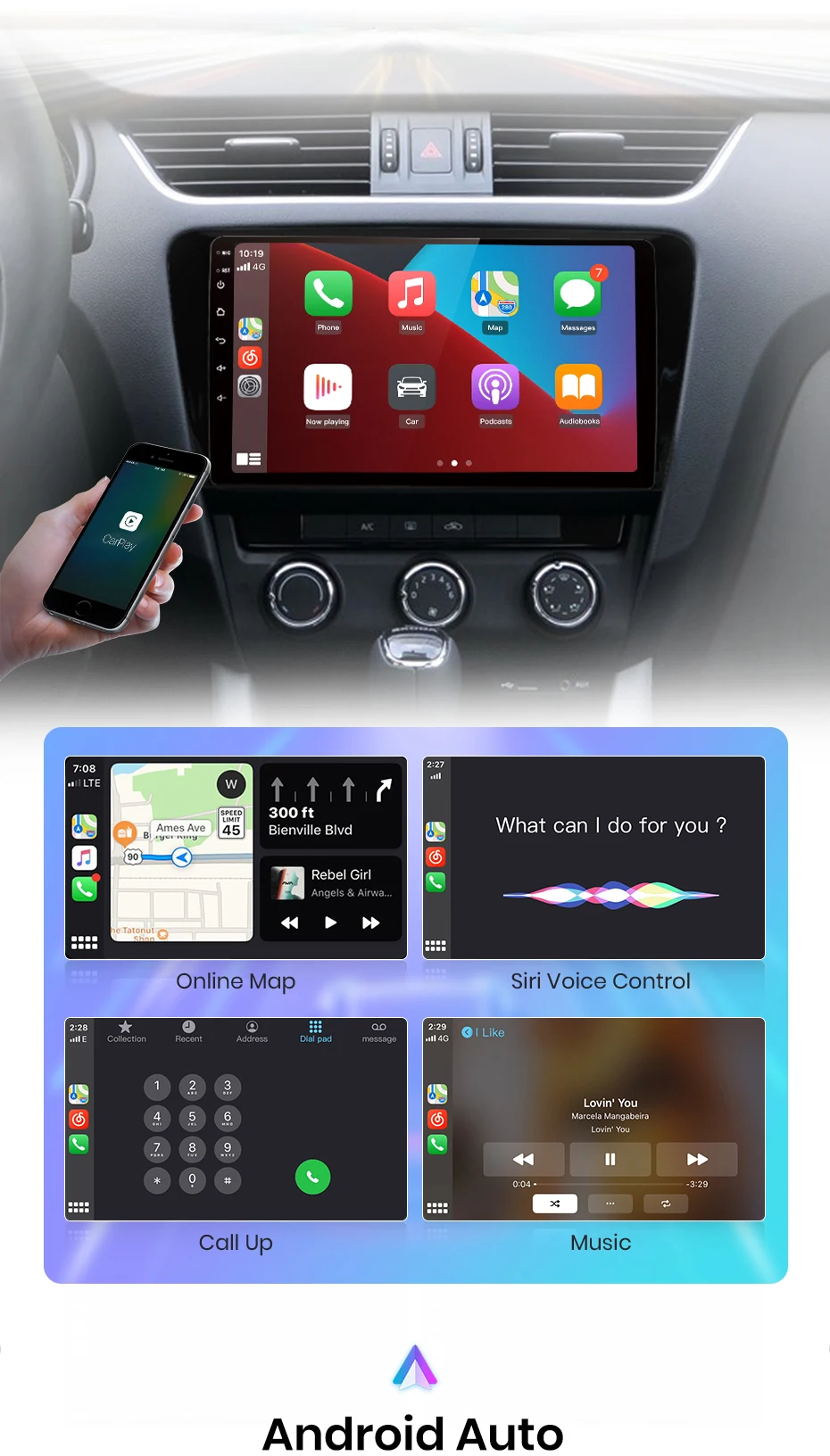 Просто подключите телефон, что позволит вам получить доступ к навигационной карте, контактам телефона, уведомлению, музыкой и многим другим. Вы можете пробуждать Siri помочь получить доступ к этим функциям, таким образом, вы можете не только уменьшить скучное время вождения, но и значительно увеличить удовольствие от вождения.