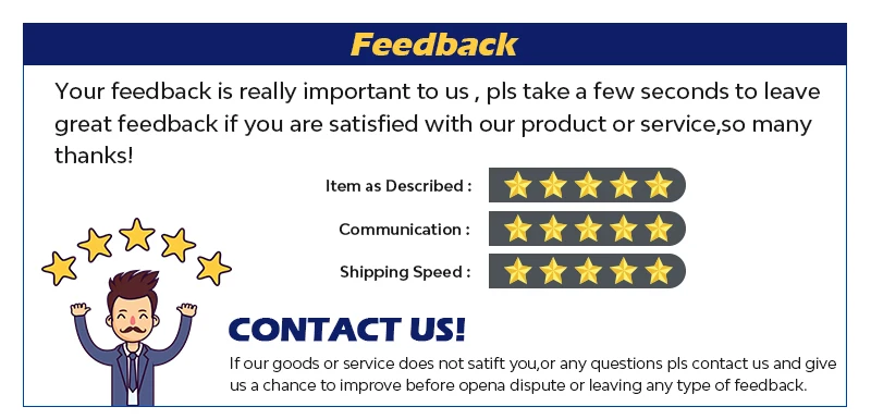 Если вы довольны полученным товаром и поставьте нам 5 звезд, мы будем очень благодарны, положительный отзыв хорош для нашего долгосрочной перспективе развития.