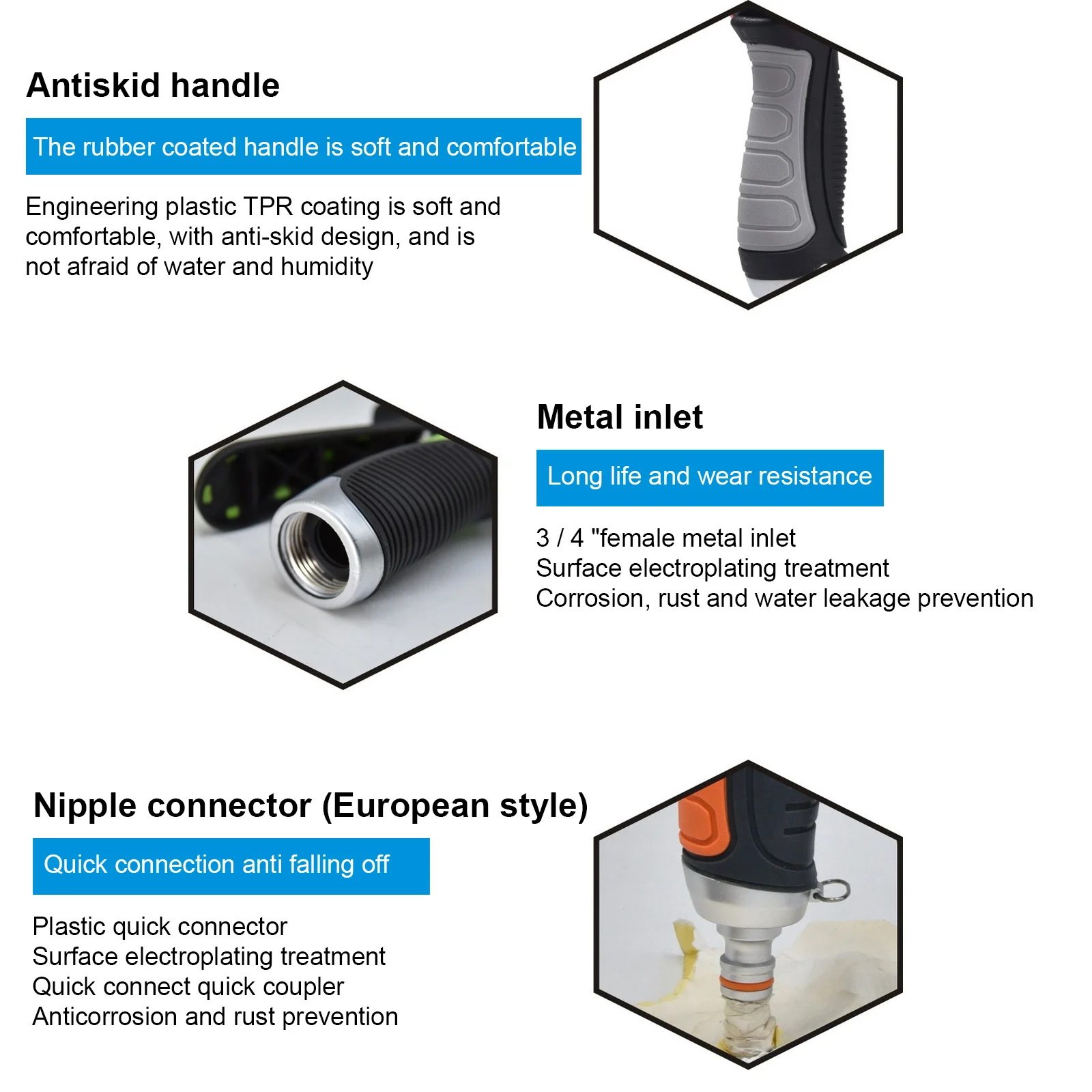 Выпускное сопло: поверните сопло для регулировки воды, 8 видов воды можно легко отрегулировать, вода ровная и мягкая, вода сильная, И диапазон подходит для различных оросительных требований.