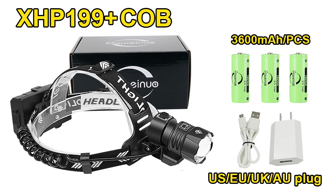 Привет всем, это последняя мощная фара XHP199 + COB, с телескопическим режимом масштабирования, с использованием 3 аккумуляторов большой емкости 18650, срок службы батареи 8-18 часов, дизайн лампы COB, подходит для различных открытых мест. Время использования COB составляет 72 часа.