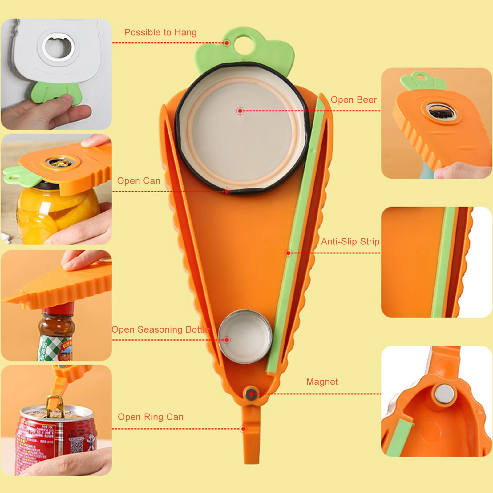 Многофункциональная открывалка для бутылок может использоваться для открытия различных видов и размеров банок, пивных бутылок и т. д. Благодаря разумной форме и противоскользящему материалу, экономия труда и экономия времени.