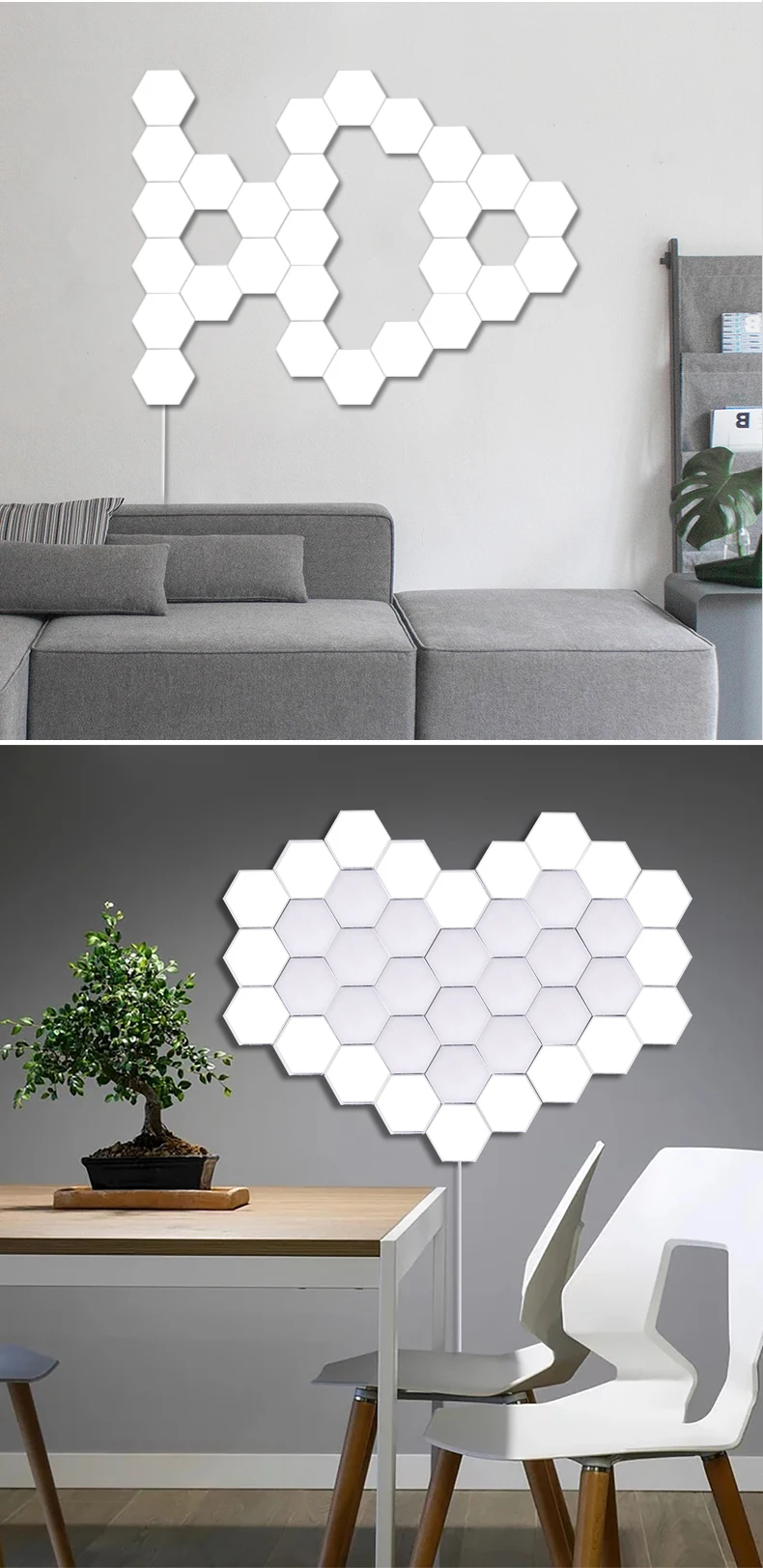 1. Это модульный сенсорный настенный светильник. Используйте шестиугольный флоппи-диск для создания любой структуры, чтобы удовлетворить ваши потребности, затем включите и выключите, прикоснувшись к нему.