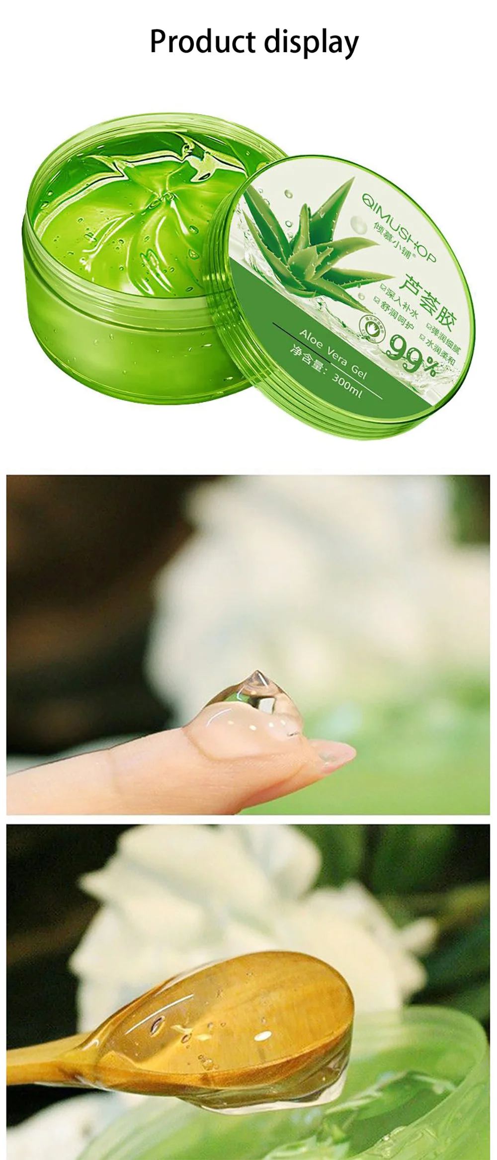 Эффективность: содержит высокоочищенную натуральную эссенцию алоэ, бутылочку многоцелевого, увлажняющего, освежающего контроля масла, восстановления после солнца, успокаивающей сухости, ингибирующей акне, можно использовать в качестве Спальной Маски.