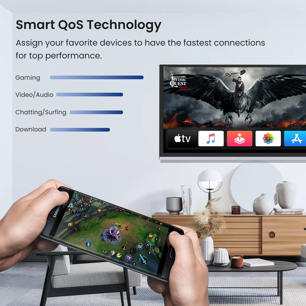 Качество обслуживания (QoS) оптимизирует трафик, так что поток с более высоким приоритетом может пройти первым, что обеспечивает лучшую производительность для видео 4K, HD-VR игры и т. Д.