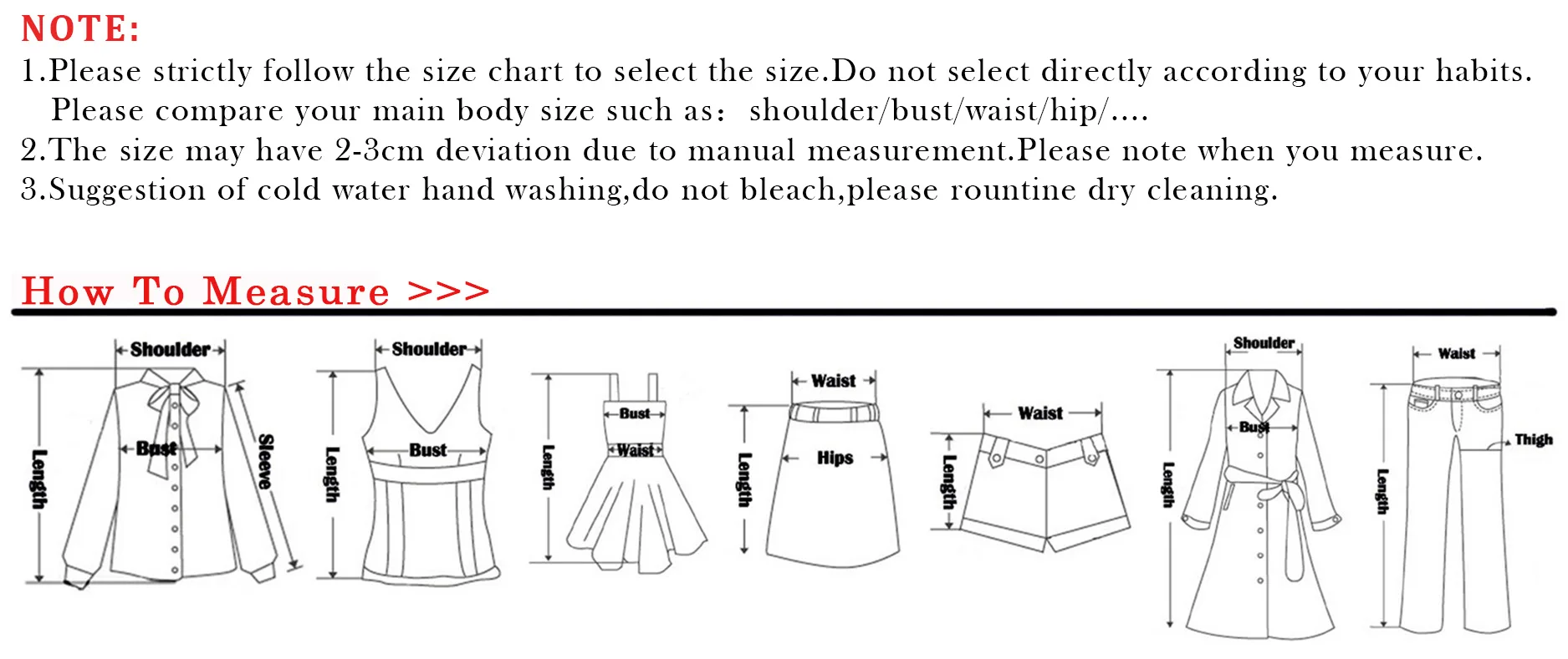 1. Пожалуйста, строго следуйте таблице размеров, чтобы выбрать размер. Не выбирайте напрямую в соответствии с вашими привычками. Пожалуйста, сравните ваш основной размер тела, такой как:Плечо/Бюст/талия/бедра/....