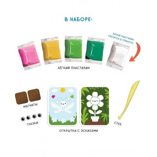 В набор входят: 2 цветные открытки с милыми персонажами, 2 магнита, 5 пакетиков легкого пластилина, в том числе 1 пакетик со светящимся в темноте, глазки, стек
