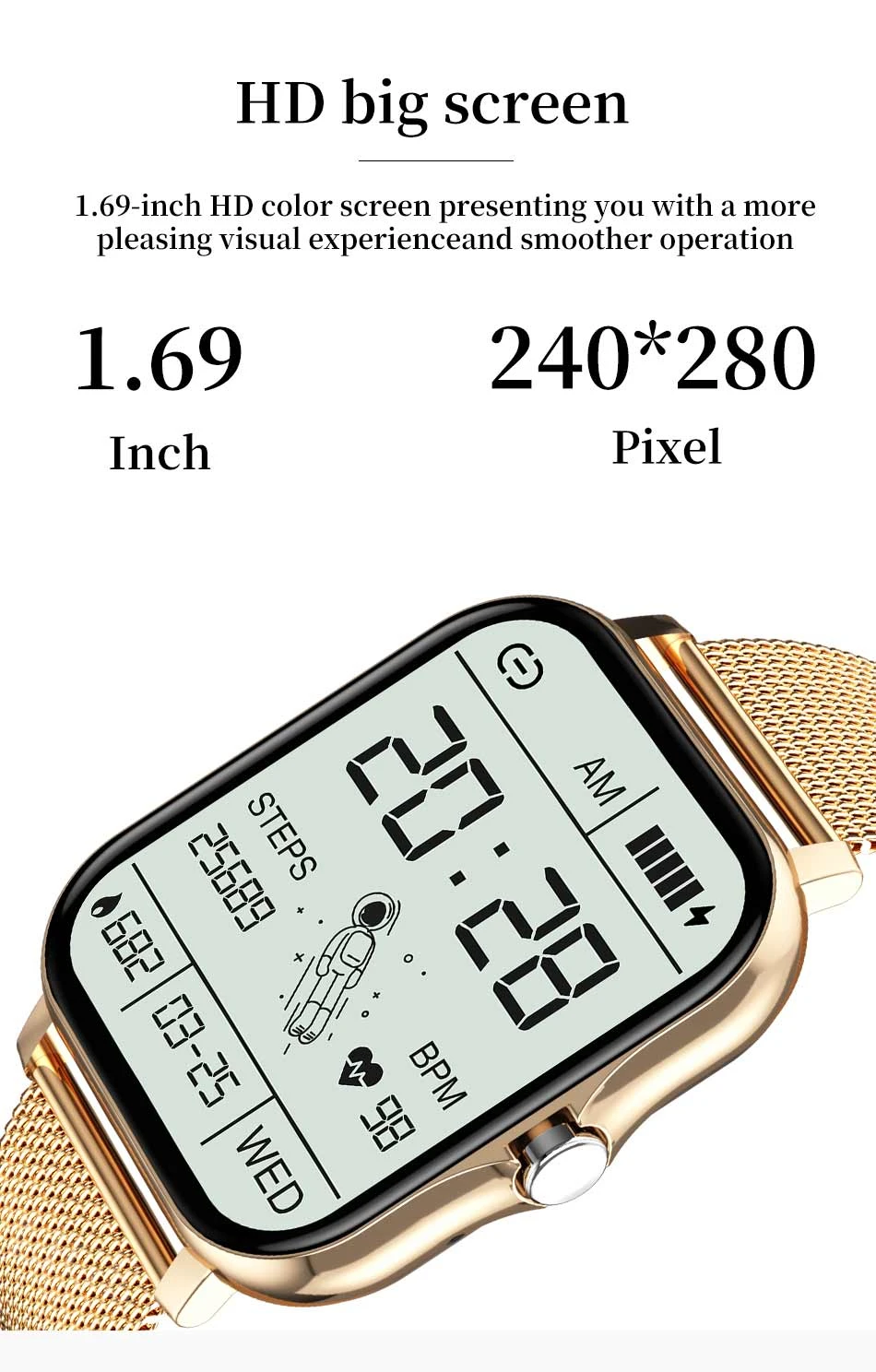 Экран: 1,69 дюйма TFT 240*280 Сенсорная панель: Полный сенсорный экран Аккумулятор: 180 мАч Приложение: FitPro Метод зарядки: Магнитная Зарядка Водонепроницаемость: IP67