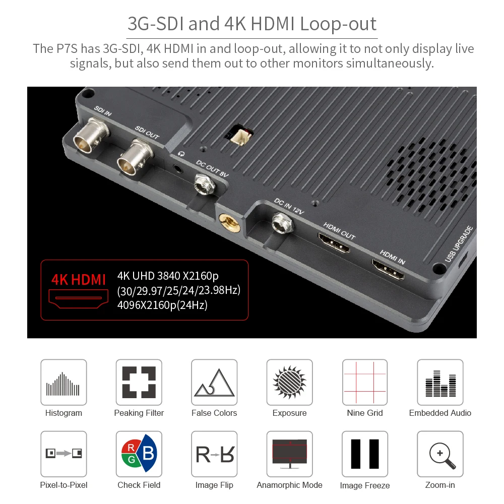 Компактный дизайн P7S включает в себя 4K HDMI и 3G-SDI, так что вы можете подключить их практически к любой DSLR, prosumer или профессиональной камере! HDMI соединение Совместимо до 4Kp30 и SDI соединение Совместимо до 3G, поддержка почти всех сигналов. Вы также можете отслеживать звука с использованием 3,5 мм стерео для наушников или, собран в динамик.