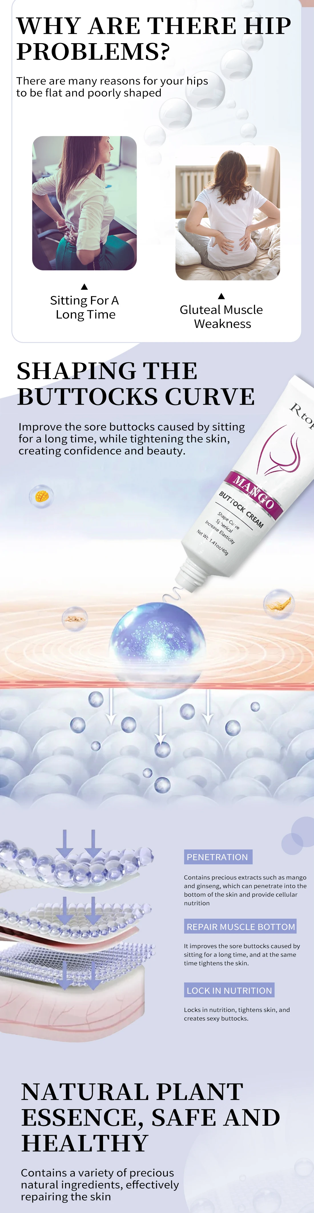 Богатые экстрактами манго и женьшеня, проникают в нижнюю часть кожи, чтобы обеспечить клеточное питание. Улучшите болезненность бедер, вызванную долгим сидением, упругой кожей, затяните жир бабочки и эффективно сформируйте линию бедер, дайте вам мягкую ягодицу, сделайте вас более уверенными и сексуальными.