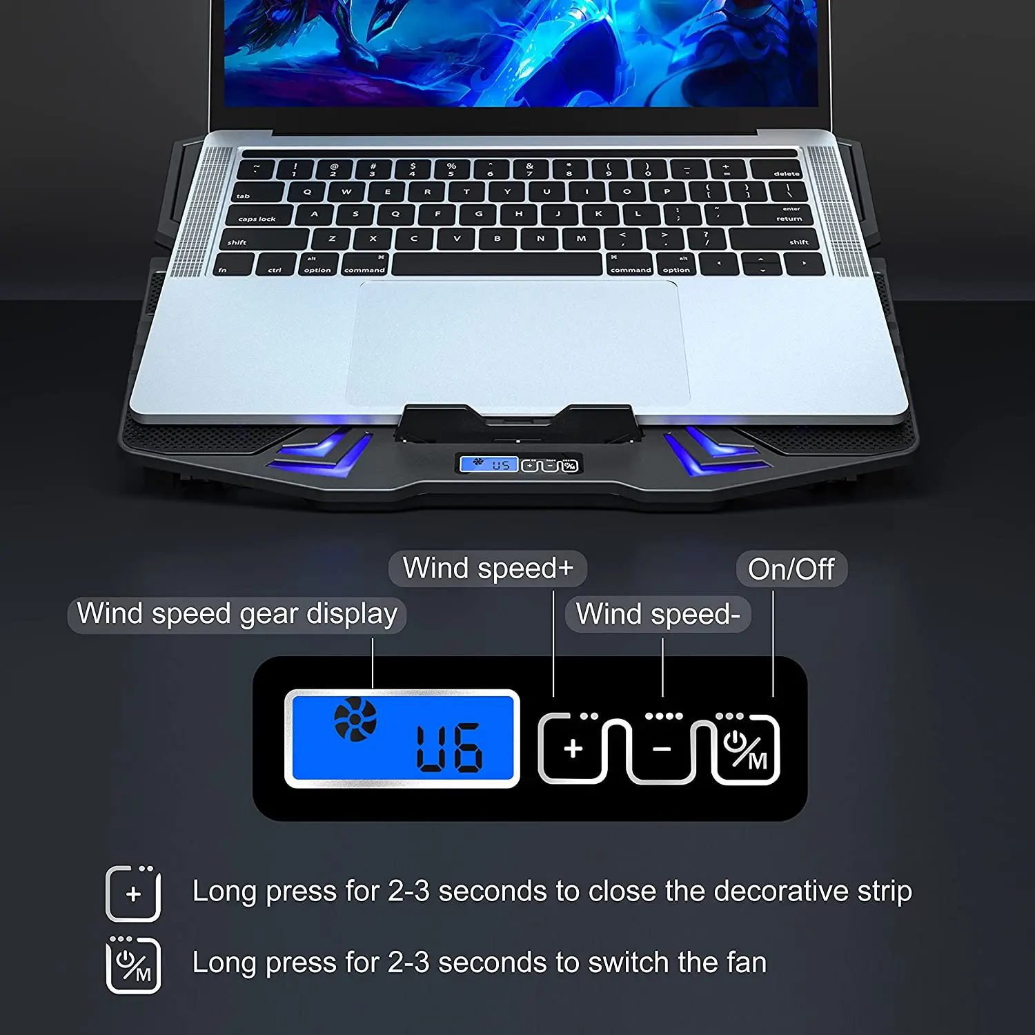 【Управление переключателем 】 это имеет небольшой ЖК-экран и кнопочную панель управления на компьютере chill mat. На экране отображается информация о различных скоростях ветра и кнопках, которые позволяют переключать различные режимы. Обеспечивает 6 скоростей ветра и 3 режима работы вентилятора.