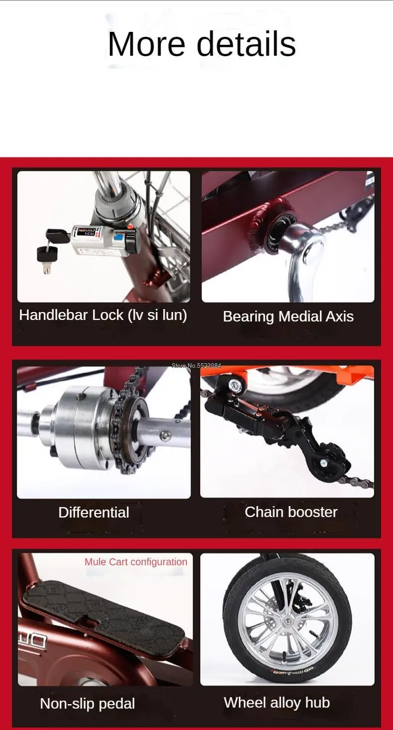 Характеристики:Название: Педальный трициклМодель: SR-01Размер колеса: 12 дюймов, 14 дюймовЦвет: винно-красный, темно-зеленый, песочное золотоГрузоподъемность: 150 кгШины: пневматические шиныМатериал оправы: алюминиевый сплавРазмер упаковки: 140*56*70 смВес брутто: 22 кг