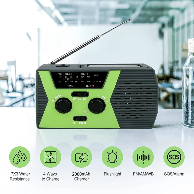 Внешний аккумулятор 2000 мА · ч: портативное радио имеет встроенный аккумулятор 2000 мА · ч с дополнительным длительным временем работы. Это солнечное радио может заряжать мобильные телефоны и другие устройства через USB. Если вы нажмете на сбой питания или вам нужно зарядить на открытом воздухе, наше радио может вам помочь. Особенно в экстремальных погодных условиях, таких как наводнения, извержения вулканов и сильные осадки, наши радиостанции могут использоваться как внешний аккумулятор и светодиодный фонарь, большой кусок аварийного оборудования.