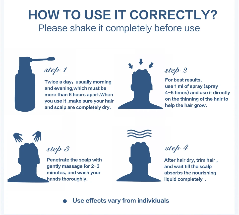 Два раза в день, в целях достижения лучшего результата пожалуйста, используйте 1 миллилитр спрей около 4 -5 спрей), непосредственно использована в меньше волос, без волос части головы, помочь роста волос; увеличить количество использования или использовать не может привести к лучшему эффект использования; В соответствии с инструкциями, Каждый флакон может использоваться в течение по крайней мере 25-30 дней может эффективно уменьшается потеря теплого выпадения волос и выпадения волос.Используйте Руководство: