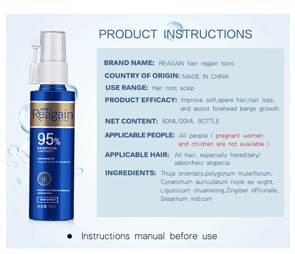 Роста волос спрей: вода, ориенталис платыкладус (тхуа восточные является), экстракт листьев, экстракт горца балтикфлоры (горца муль EIFLORUM), экстракт корня (CYNANCHUM AURICULATUMROYLE Ex Уайт), экстракт корня этанол, Ligusticum chuanxiong (LIGUSTICUM CHUANXIONG), экстракт имбиря (ZINGIBER лекарственных E), экстракт корня кунжутное масло (SESAMUM INDICUM), экстракт семян Бис (гидроксиметил) imidazolyl мочевины, бензалкония бромидИспользование: