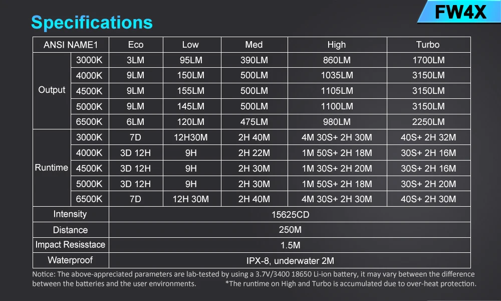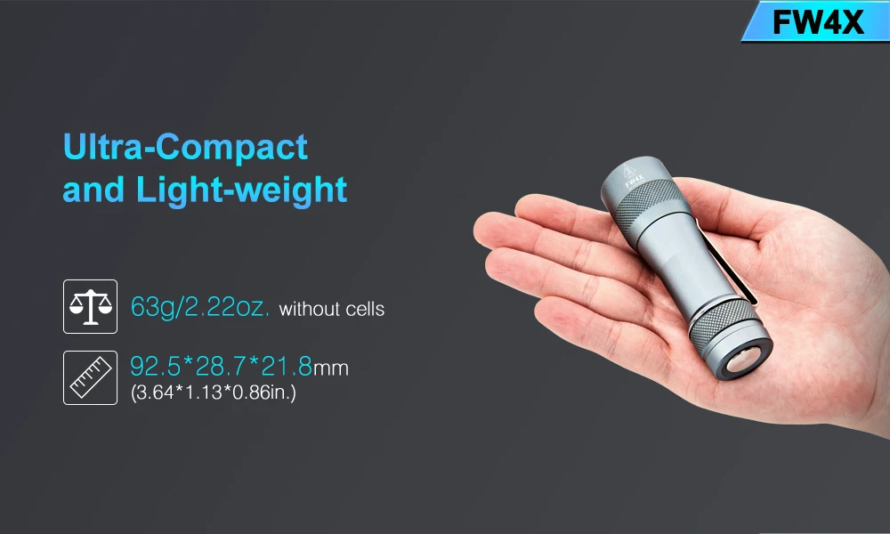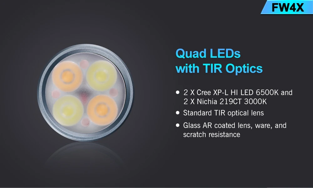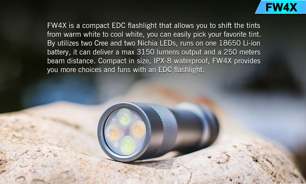 FW4X-это компактный фонарик EDC, который позволяет перемещать оттенки с теплого белого на холодный белый, вы можете легко выбрать свой любимый оттенок. Используя два светодиода Cree и два светодиода Nichia, работает на одном литий-ионном аккумуляторе 18650, он может обеспечить максимальный выход 3150 люменов и расстояние луча 250 метров. Компактный размер, IPX-8 водонепроницаемый, FW4X предоставляет вам больше вариантов и функций с фонариком EDC.