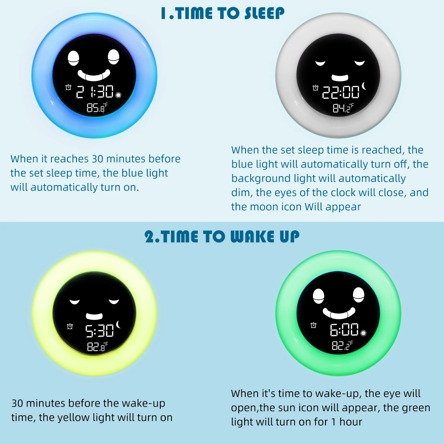 2. Этот будильник отражает абстрактное время с визуальными изображениями, сообщая детям время засыпать и проснуться. Например, Ночной светильник автоматически выключается после заданного времени сна, фоновый светильник тускнеет, глаза будильника будут закрыты, и появится значок Луны. Примечание: напоминание о значке и настройка будильника разделены, вы можете установить один или два.
