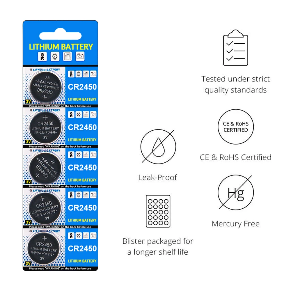 Эта блистерная упаковка для литиевой батареи CR 2450 обеспечивает дополнительную защиту от протекания и коррозии; Каждая аккумуляторная батарея не содержит ртуть и не протекает;