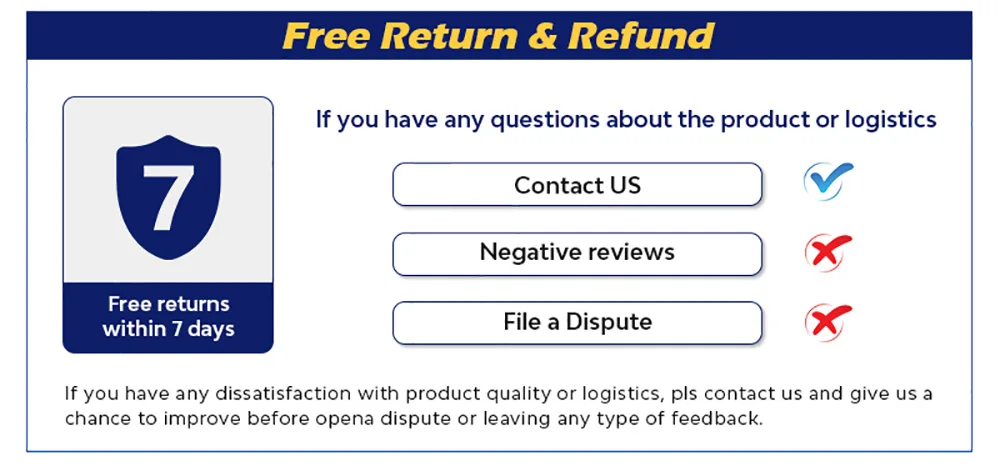 ● Если у вас есть какие-либо проблемы с логистикой или продуктом, пожалуйста, свяжитесь с нашей службой поддержки клиентов в любое время. Негативные отзывы и споры не могут решить проблему. Свяжитесь с нами, и мы решим это для вас.