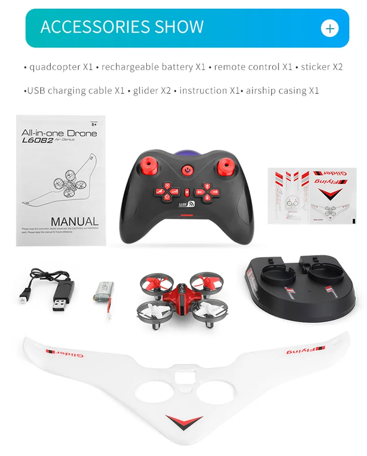 Аксессуары: Avión X1/cuerpo deslizante de espuma X2/cuerpo hovercraft X1/pegatina X2/USBX1/destornillador X1