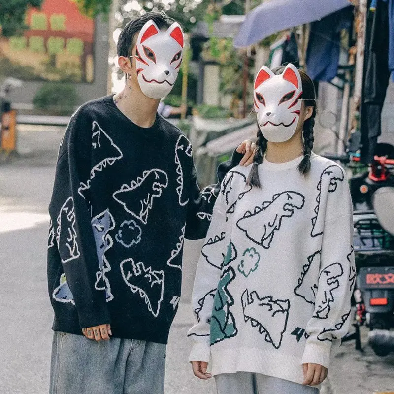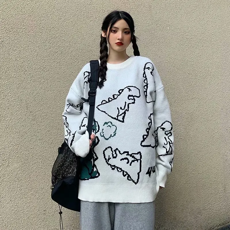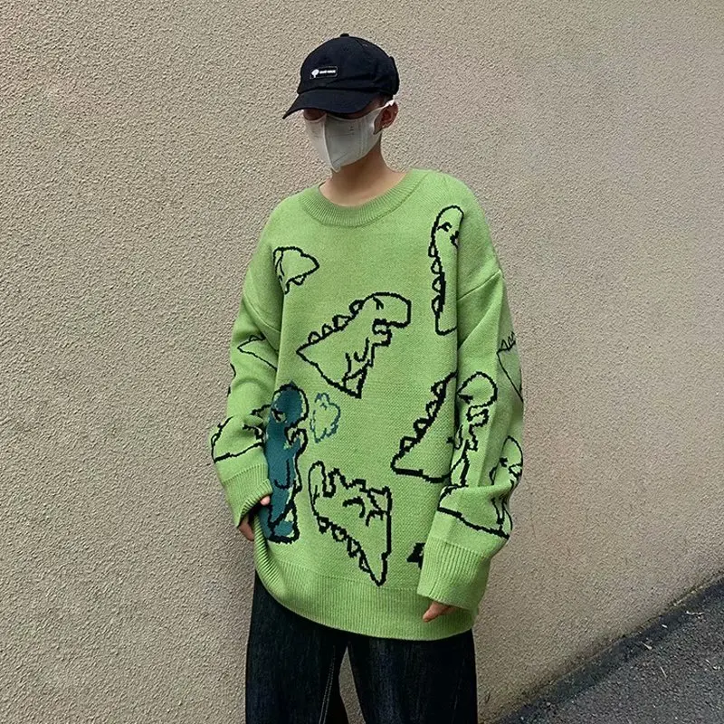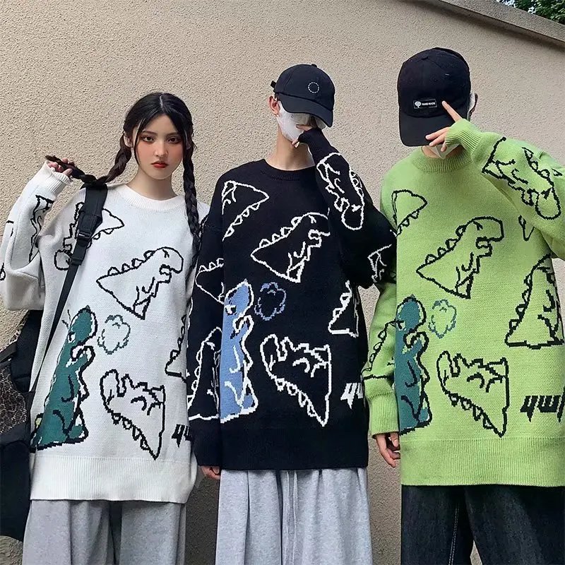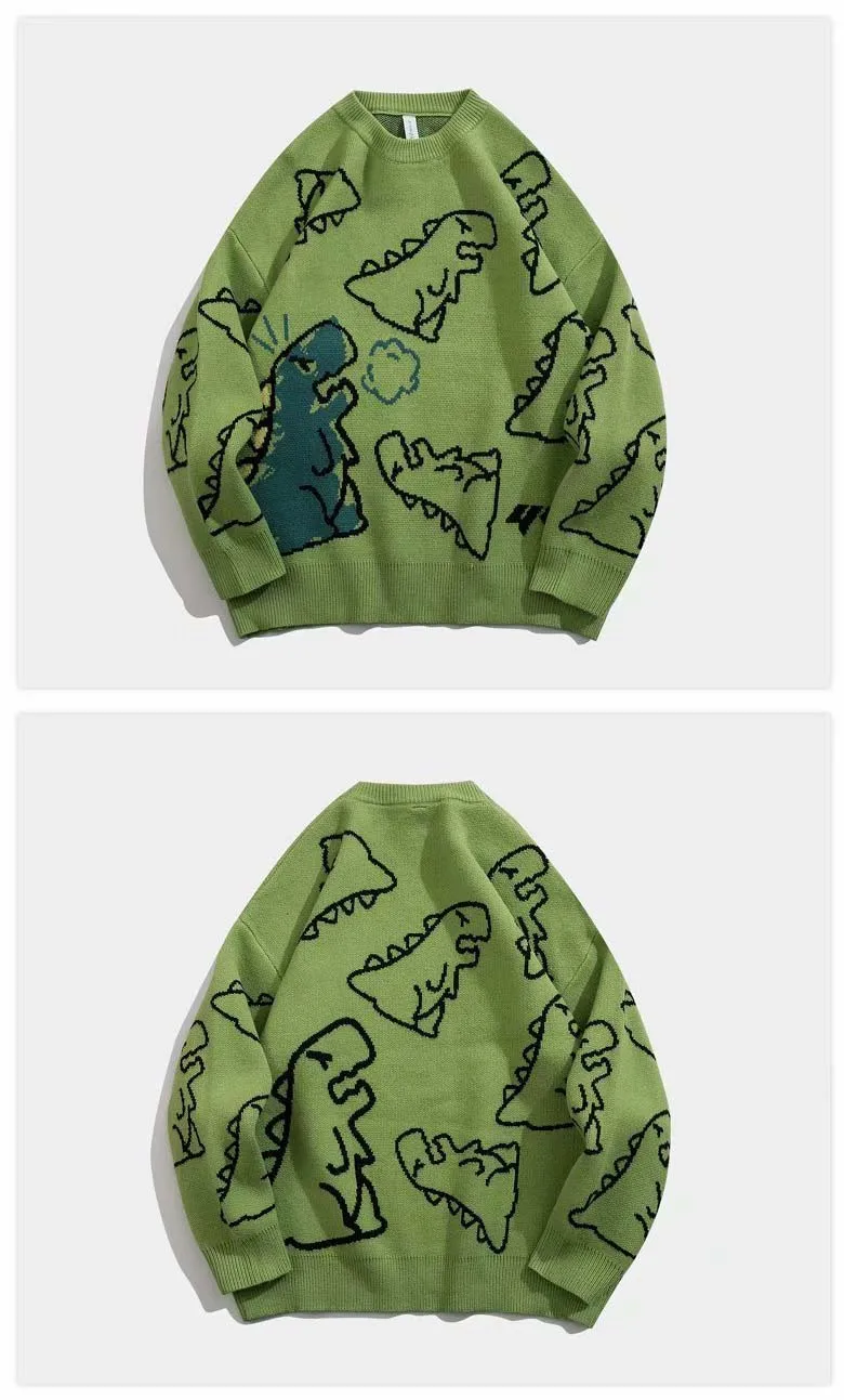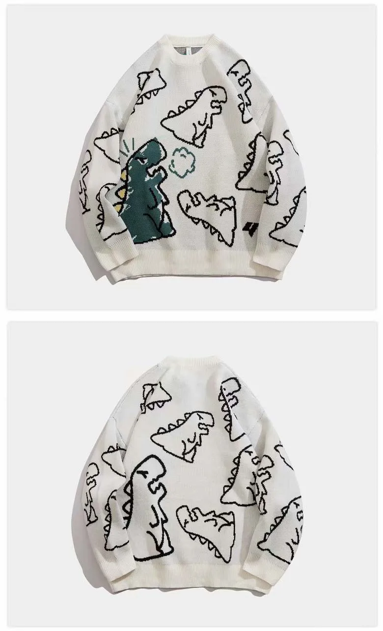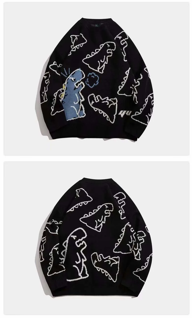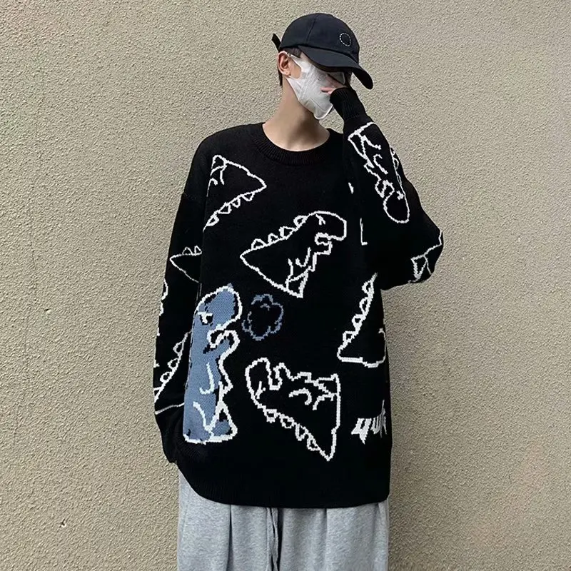 Мужской свитер в стиле Харадзюку, Модный вязаный пуловер в стиле хип-хоп, уличная одежда с рисунком динозавра, повседневные винтажные свитера с круглым вырезом