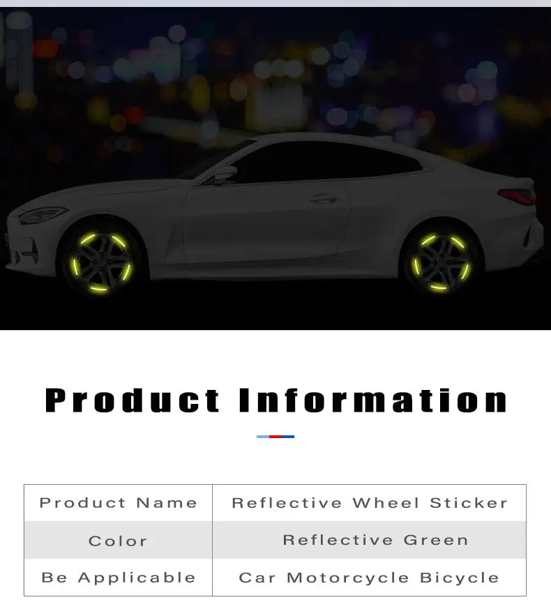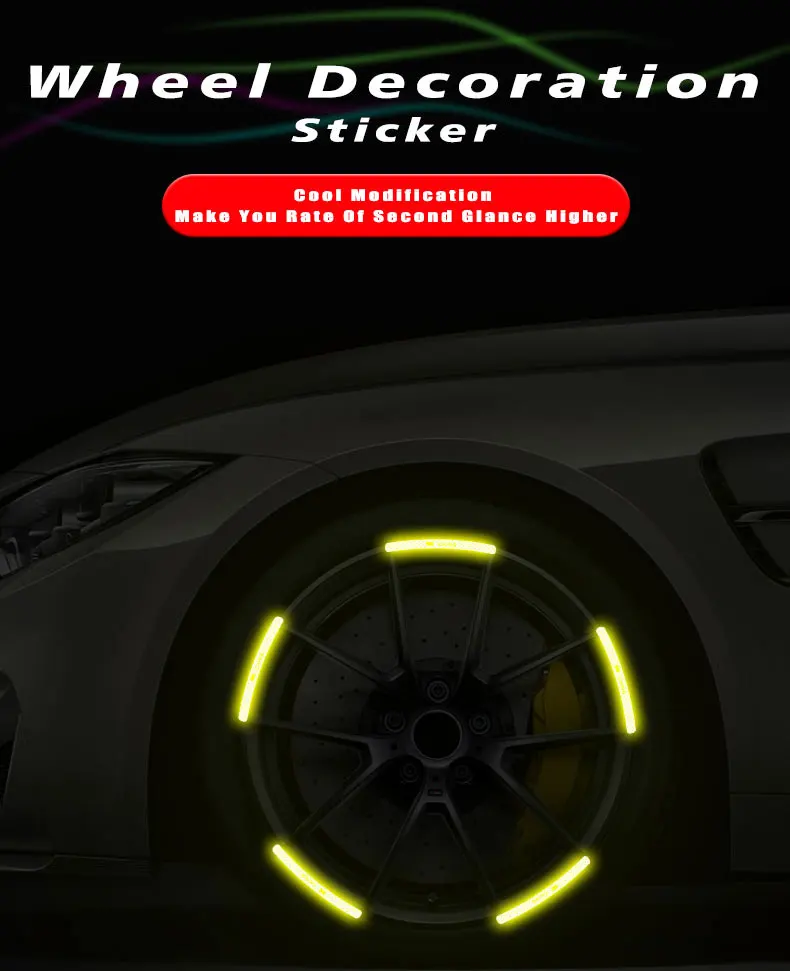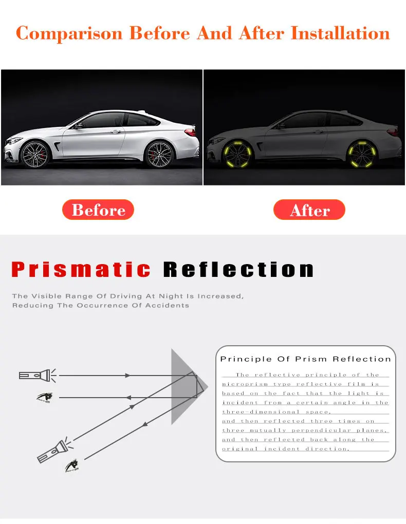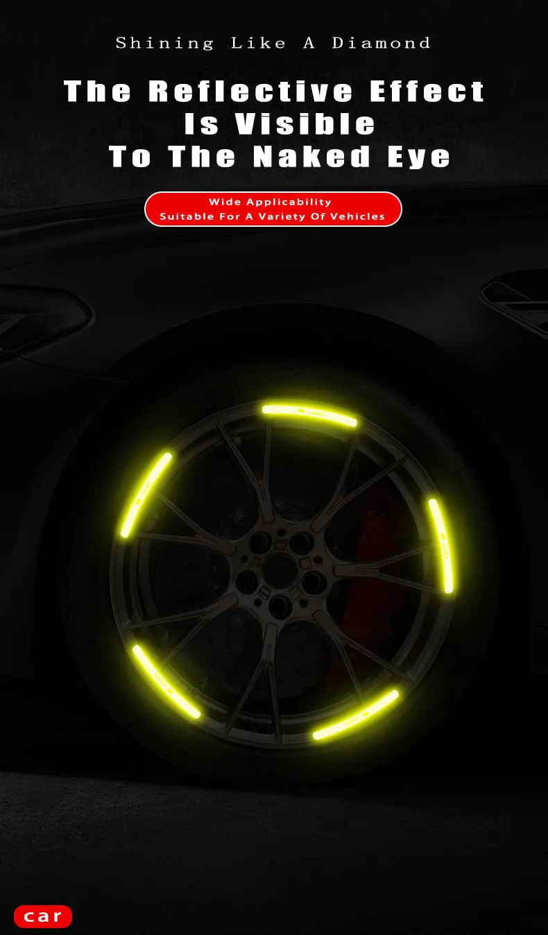 1. Wheel Hub Reflective Stickers: At night or in a dark environment, these high visibility reflective stickers stand out on the road, reflects light towards the drivers, noticeable and remind they to keep their distance, improve driving safety.