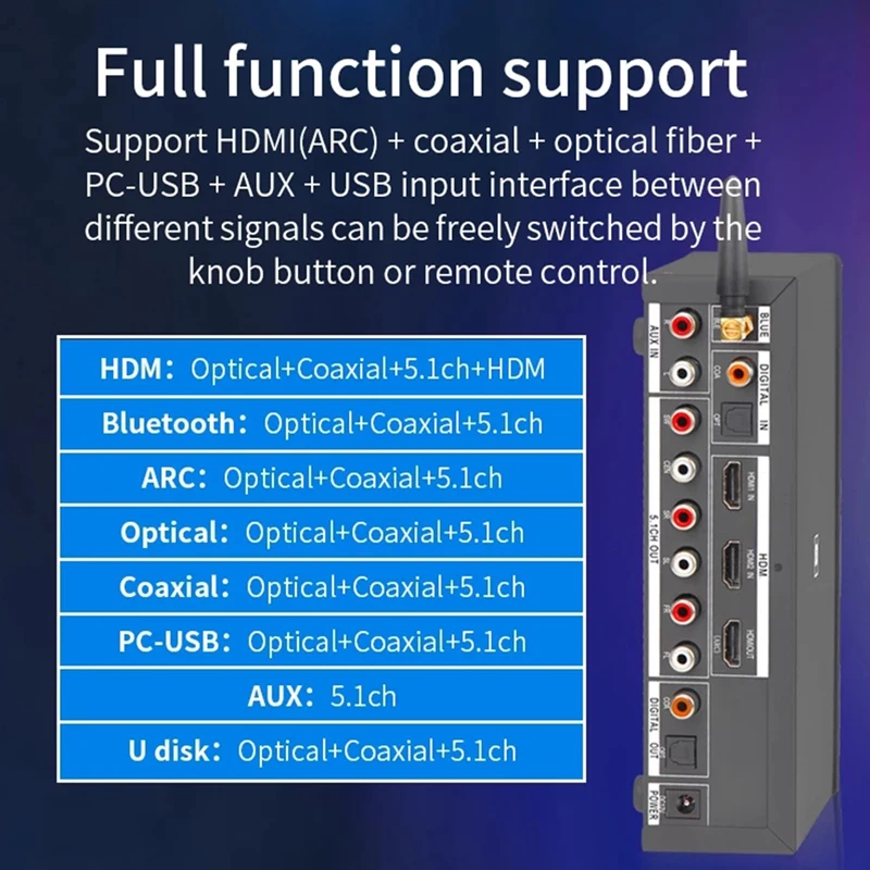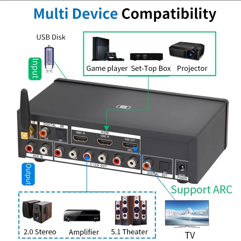 Все источники сигнала (HDMI совместимый/ARC/COXIAL/OPTICAL/PC-USB/AUX/USB) могут декодировать до 5.1ch выход.